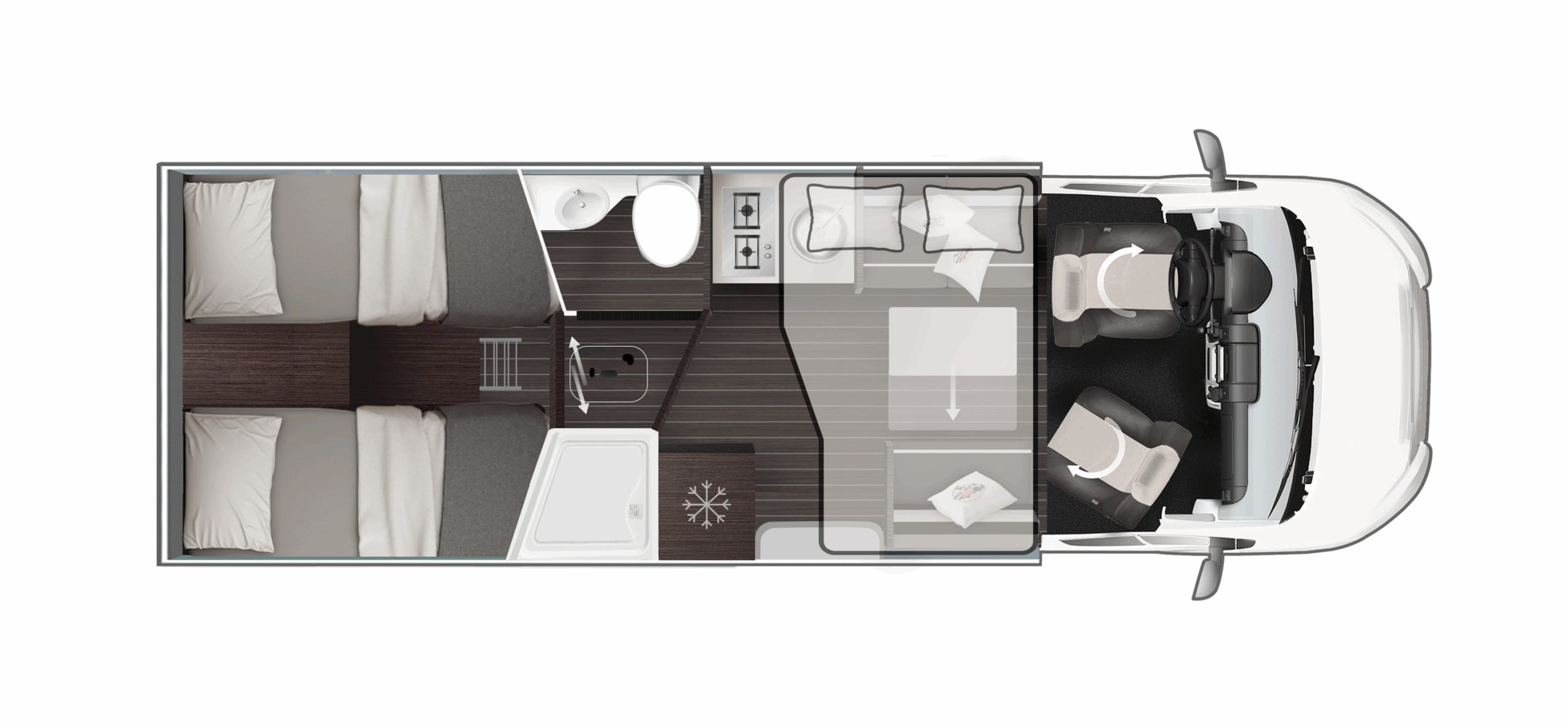 CZĘŚĆ KEMPINGOWA: izolowane ściany i okna, dach podnoszony z 2 miejscami do spania, lodówka 42 L z zamrażalnikiem, kuchenka gazowa 2 palnikowa z przykryciem, zintegrowany zlewozmywak, miejsce na butle gazową 1 x 2,75 kg, zbiornik wody czystej (50l), zbiornik wody brudnej (30l), solidne szafki do przechowywania, stół, 4xUSB, 4x12V, 3x230V, oświetlenie wewnętrzne, akumulator części kempingowej, panel sterowania.