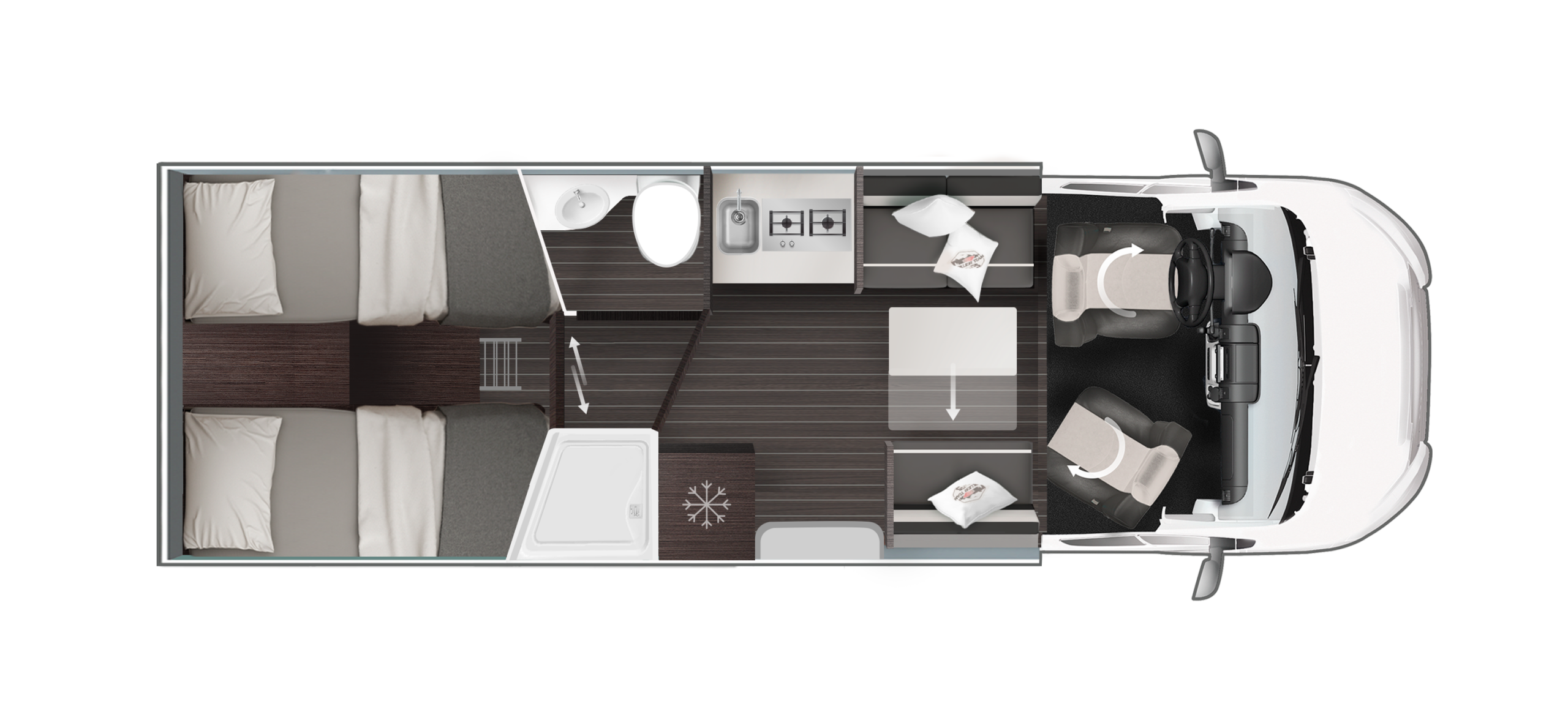 PACK SELECT – 8F / 80dF – FIAT – ESC z ASR, ROM, asystentem wjazdu, asystentem wiatru bocznego, kontrolą stabilności holowania i automatycznym hamowaniem po kolizji, DAB PIONEER® system multimedialny z ekranem 6.8” i APPLE CAR PLAY/ANDROID AUTO, RKE – drugi pilot kluczyków, elektryczne lusterka boczne z odmrażaniem, regulowane fotele w kabinie, kamera cofania z ekranem kontrolnym wbudowanym w deskę rozdzielczą, rolety okien kabiny, drzwi kempingowe blokowane w 2 punktach z oknem i koszem, moskitiera drzwi kempingowych, system do podłączenia 2 butli gazowych z czujnikiem przeciw wypadkowym