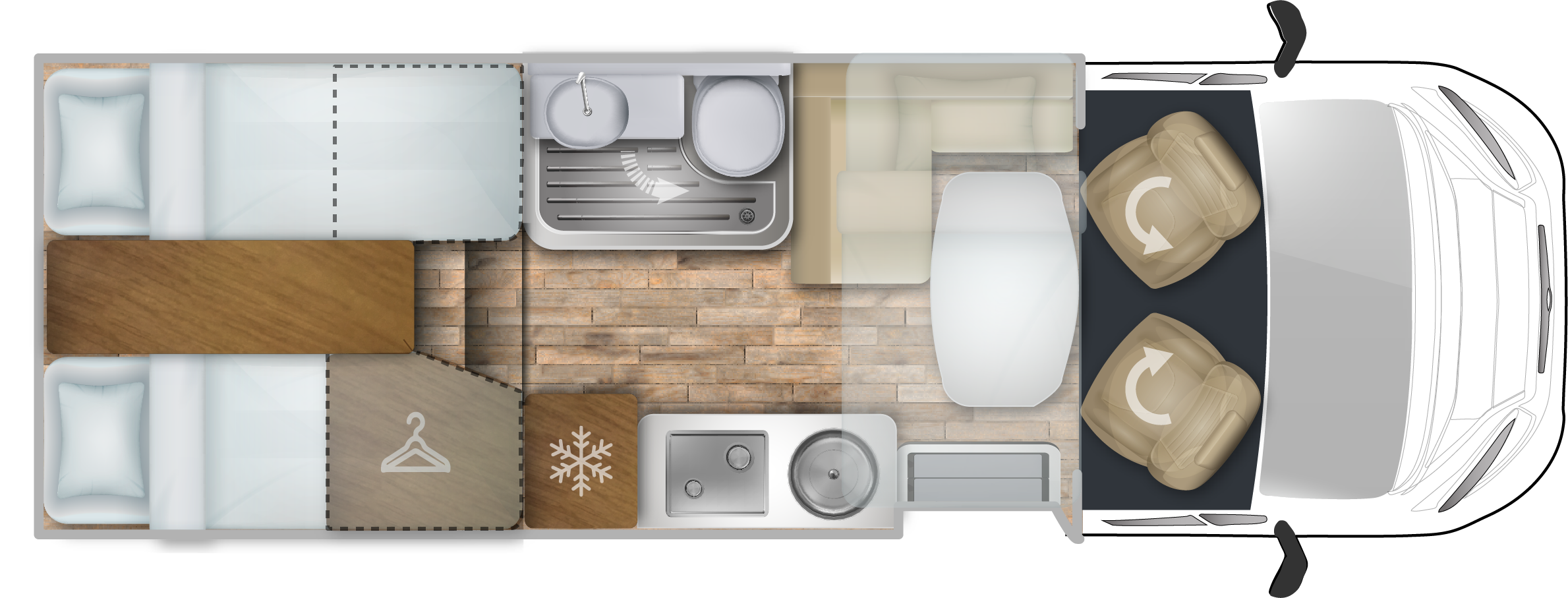 DMC 3500 kg, szerszy rozstaw osi, START&STOP, ABS + ESP, tempomat z limiterem prędkości, poduszka powietrzna kierowcy i pasażera, klimatyzacja automatyczna, lusterka boczne z odmrażaniem, radio DAB z 12” ekranem z Apple CarPlay / AndroidAuto, 70L zbiornik oleju napędowego, zestaw naprawczy koła, 16” stalowe koła z kołpakami, lakier kabiny biały, światła przeciwmgielne, elektryczny hamulec ręczny, automatyczne wycieraczki, automatyczne reflektory, światła dzienne halogenowe, kamera cofania, FORD emergency service, system CMBS (system ograniczający skutki kolizji), system monitorowania pasa ruchu, system rozpoznawania znaków prędkości, Wrong-Way system, przednie czujniki parkowania, TPMS – system monitorowania ciśnienia w oponach, 8” pół-cyfrowy panel komputera pokładowego, modem 5G, elektrycznie regulowana noga stołu w części salonu (230/30), elektrycznie regulowane łóżko opuszczane w części salonu, zagłówki foteli w układach face2face, okna SEITZ, 1 x ISOFIX, 100% LED światła tylne, gniazda USB w części salonu i sypialni, gniazdo 230V w garażu, drzwi XL z jednym punktem ryglowania, moskitiera drzwi kempingowych, 2 palnikowa kuchenka gazowa, lodówka absorpcyjna o pojemności 137 L, ogrzewanie Truma Gas Combi 4, termiczne zaciemnienia kabiny, okna dachowe Mini Heky 40 x 40 cm, okno dachowe w łazience 28 x 28 cm, możliwość połączenia łóżek pojedynczych, standardowa tapicerka Fitgrey / Cozy (materiał)