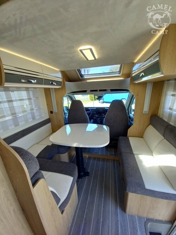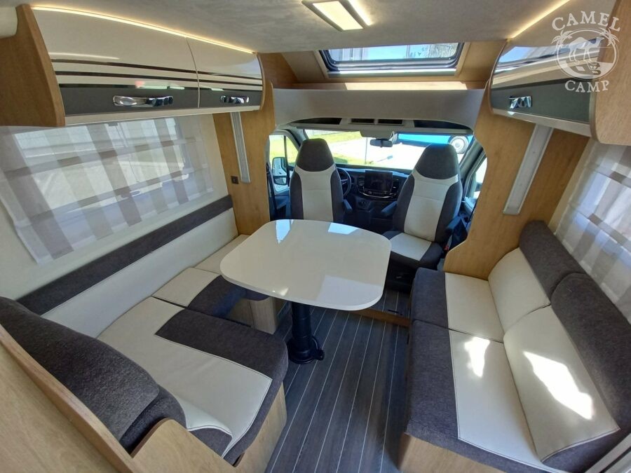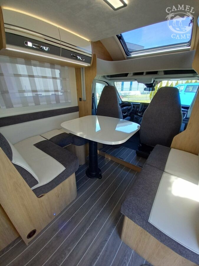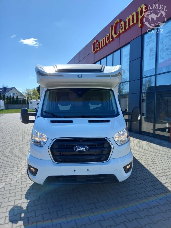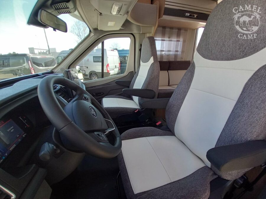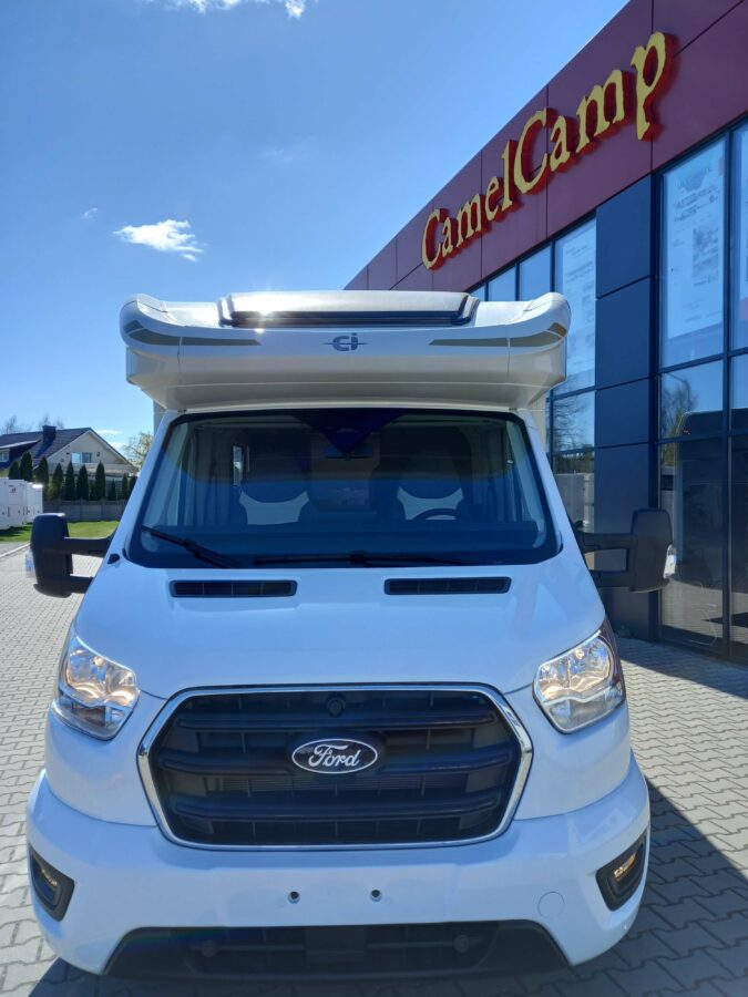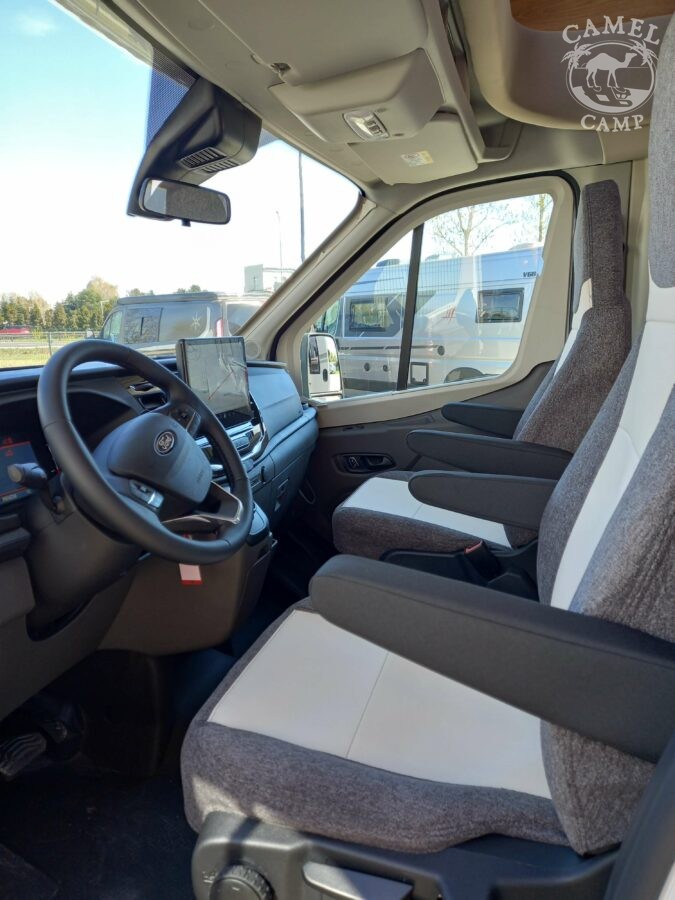 Ford Transit 2,0 130 KM, DMC 3500kg, szerszy rozstaw osi, START&STOP, ABS + ESP, tempomat z limiterem prędkości, poduszka powietrzna kierowcy i pasażera, automatyczna skrzynia biegów (tylko alkowa), klimatyzacja automatyczna, lusterka boczne z odmrażaniem, radio DAB z 12” ekranem z Apple CarPlay / AndroidAuto, 70L zbiornik oleju napędowego, zestaw naprawczy koła, 16” stalowe koła, kabina w białym kolorze, światła przeciwmgielne, elektryczny hamulec ręczny, automatyczne wycieraczki z czujnikiem deszczu, automatyczne reflektory, światła dzienne halogenowe, kamera cofania, FORD emergency service, system CMBS (system ograniczający skutki kolizji), system monitorowania pasa ruchu, system rozpoznawania znaków prędkości, Wrong-Way system, przednie czujniki parkowania, TPMS – system monitorowania ciśnienia w oponach, 8” pół-cyfrowy panel komputera pokładowego, elektrycznie regulowane łóżko opuszczane w części salonu, okna SEITZ, gniazda USB w części salonu i sypialni, gniazdo 220V w garażu, drzwi XL z oknem i moskiterią z jednym punktem ryglowania (poza układem 77M/277M), 3 palnikowa kuchenka gazowa, lodówka absorpcyjna o pojemności 135 L lub 145 L (w zależności od układu), ogrzewanie Truma Gas Combi C4, panel kontrolny CP-PLUS, termiczne zaciemnienia kabiny, okno panoramiczne (jeśli półintegra), możliwość połączenia łóżek pojedynczych, pokrowce foteli w kabinie kierowcy, okna dachowe Mini Heky 40 x 40 cm, okno w łazience, standardowa tapicerka Melange (ekoskóra + materiał)