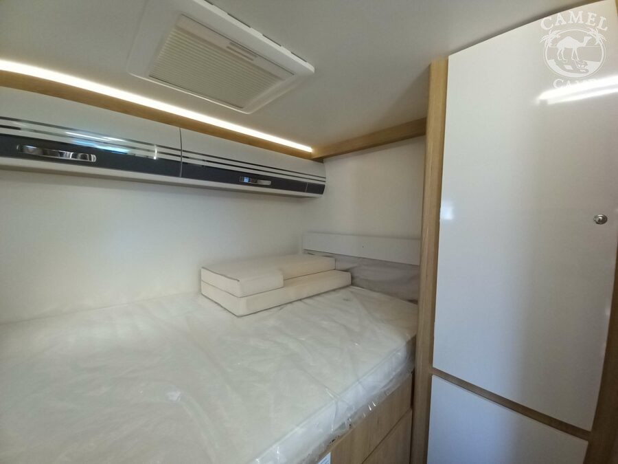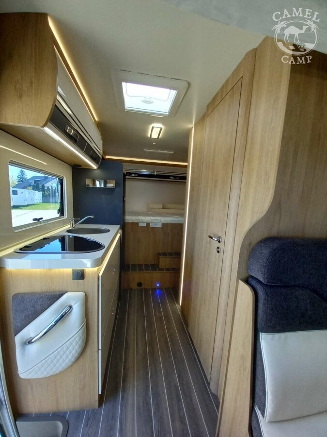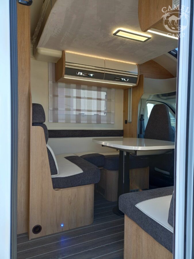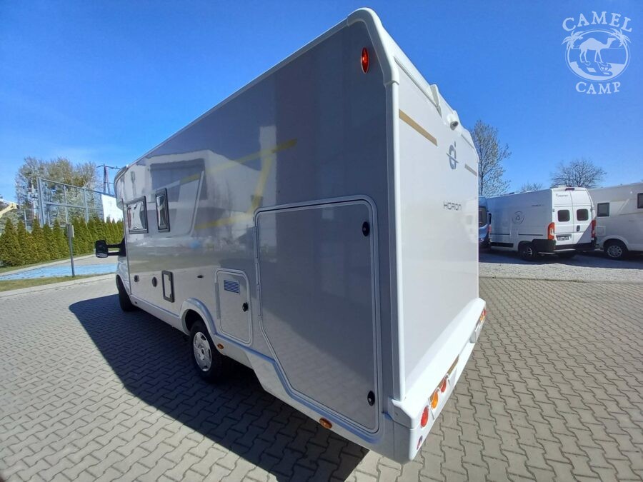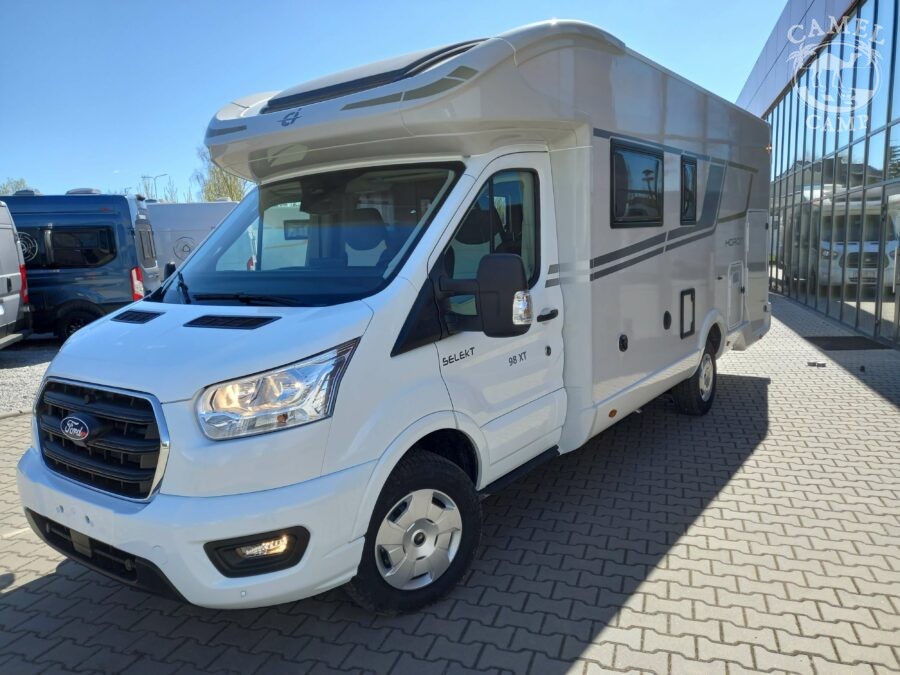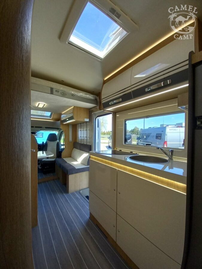 Ford Transit 2,0 130 KM, DMC 3500kg, szerszy rozstaw osi, START&STOP, ABS + ESP, tempomat z limiterem prędkości, poduszka powietrzna kierowcy i pasażera, automatyczna skrzynia biegów (tylko alkowa), klimatyzacja automatyczna, lusterka boczne z odmrażaniem, radio DAB z 12” ekranem z Apple CarPlay / AndroidAuto, 70L zbiornik oleju napędowego, zestaw naprawczy koła, 16” stalowe koła, kabina w białym kolorze, światła przeciwmgielne, elektryczny hamulec ręczny, automatyczne wycieraczki z czujnikiem deszczu, automatyczne reflektory, światła dzienne halogenowe, kamera cofania, FORD emergency service, system CMBS (system ograniczający skutki kolizji), system monitorowania pasa ruchu, system rozpoznawania znaków prędkości, Wrong-Way system, przednie czujniki parkowania, TPMS – system monitorowania ciśnienia w oponach, 8” pół-cyfrowy panel komputera pokładowego, elektrycznie regulowane łóżko opuszczane w części salonu, okna SEITZ, gniazda USB w części salonu i sypialni, gniazdo 220V w garażu, drzwi XL z oknem i moskiterią z jednym punktem ryglowania (poza układem 77M/277M), 3 palnikowa kuchenka gazowa, lodówka absorpcyjna o pojemności 135 L lub 145 L (w zależności od układu), ogrzewanie Truma Gas Combi C4, panel kontrolny CP-PLUS, termiczne zaciemnienia kabiny, okno panoramiczne (jeśli półintegra), możliwość połączenia łóżek pojedynczych, pokrowce foteli w kabinie kierowcy, okna dachowe Mini Heky 40 x 40 cm, okno w łazience, standardowa tapicerka Melange (ekoskóra + materiał)