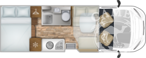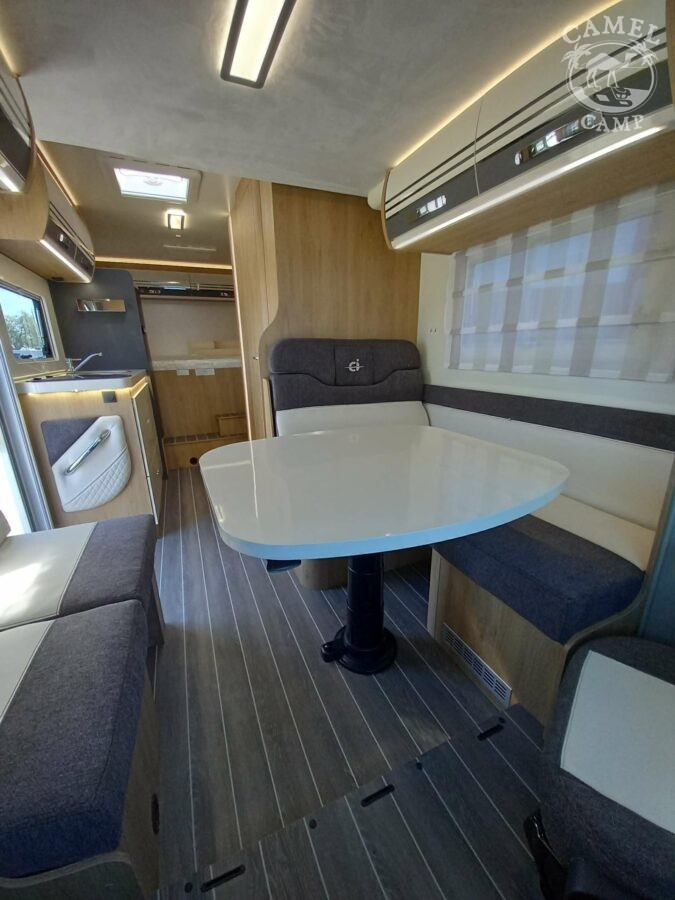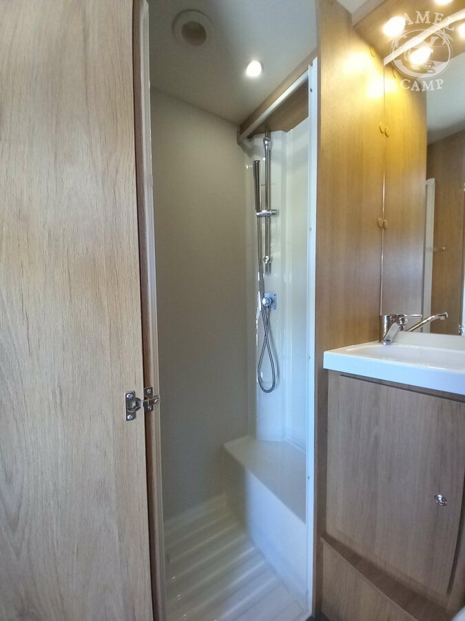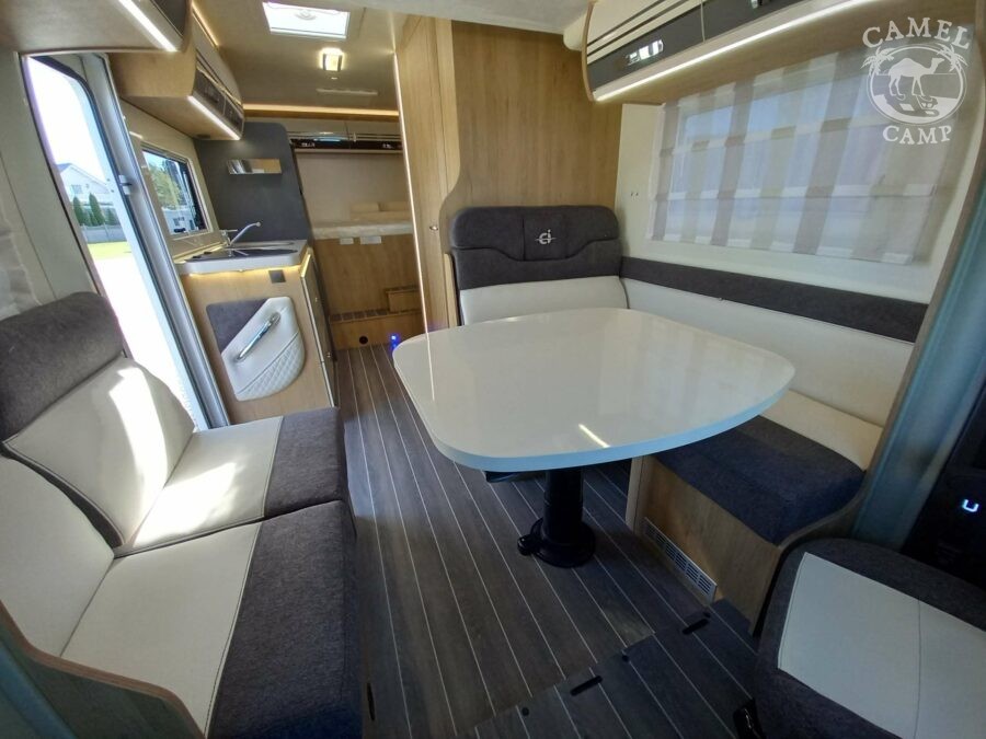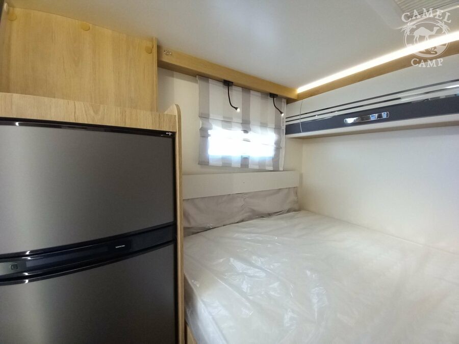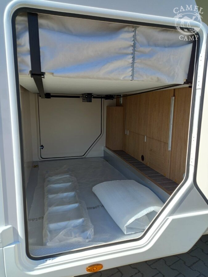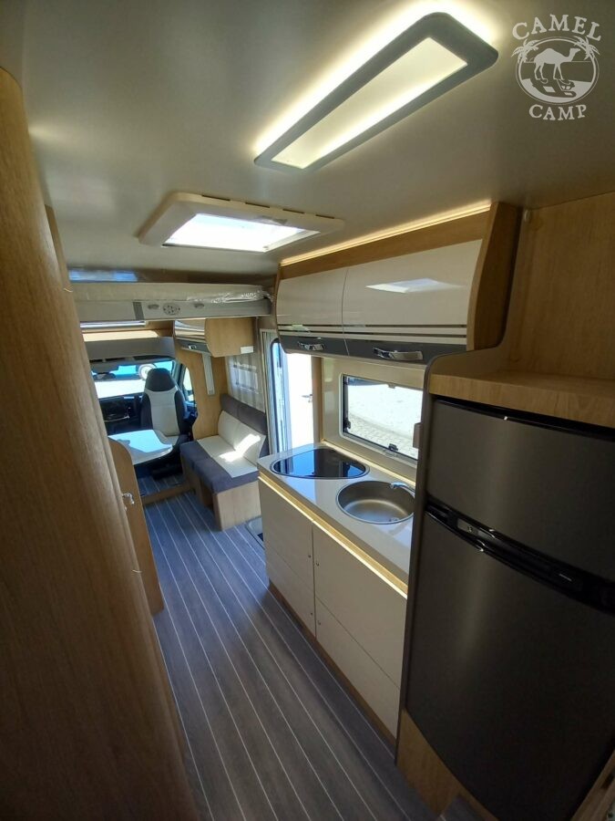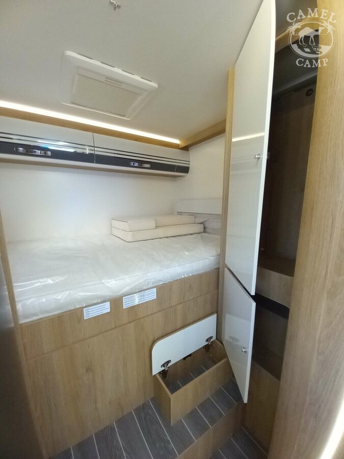 Ford Transit 2,0 130 KM, DMC 3500kg, szerszy rozstaw osi, START&STOP, ABS + ESP, tempomat z limiterem prędkości, poduszka powietrzna kierowcy i pasażera, automatyczna skrzynia biegów (tylko alkowa), klimatyzacja automatyczna, lusterka boczne z odmrażaniem, radio DAB z 12” ekranem z Apple CarPlay / AndroidAuto, 70L zbiornik oleju napędowego, zestaw naprawczy koła, 16” stalowe koła, kabina w białym kolorze, światła przeciwmgielne, elektryczny hamulec ręczny, automatyczne wycieraczki z czujnikiem deszczu, automatyczne reflektory, światła dzienne halogenowe, kamera cofania, FORD emergency service, system CMBS (system ograniczający skutki kolizji), system monitorowania pasa ruchu, system rozpoznawania znaków prędkości, Wrong-Way system, przednie czujniki parkowania, TPMS – system monitorowania ciśnienia w oponach, 8” pół-cyfrowy panel komputera pokładowego, elektrycznie regulowane łóżko opuszczane w części salonu, okna SEITZ, gniazda USB w części salonu i sypialni, gniazdo 220V w garażu, drzwi XL z oknem i moskiterią z jednym punktem ryglowania (poza układem 77M/277M), 3 palnikowa kuchenka gazowa, lodówka absorpcyjna o pojemności 135 L lub 145 L (w zależności od układu), ogrzewanie Truma Gas Combi C4, panel kontrolny CP-PLUS, termiczne zaciemnienia kabiny, okno panoramiczne (jeśli półintegra), możliwość połączenia łóżek pojedynczych, pokrowce foteli w kabinie kierowcy, okna dachowe Mini Heky 40 x 40 cm, okno w łazience, standardowa tapicerka Melange (ekoskóra + materiał)