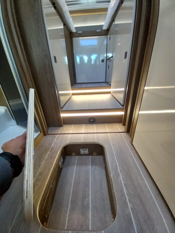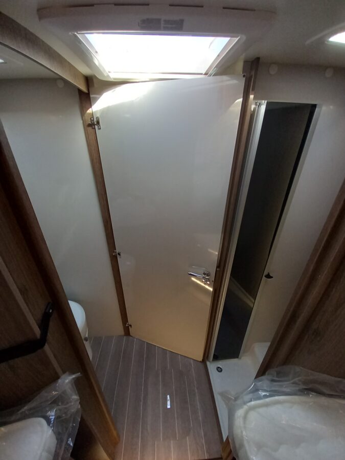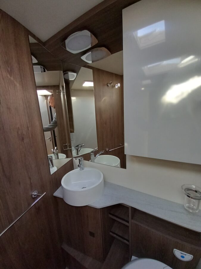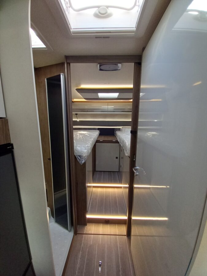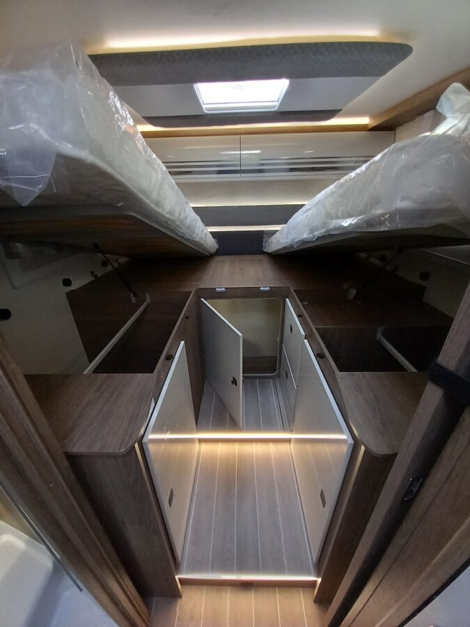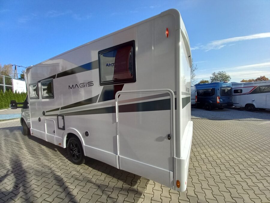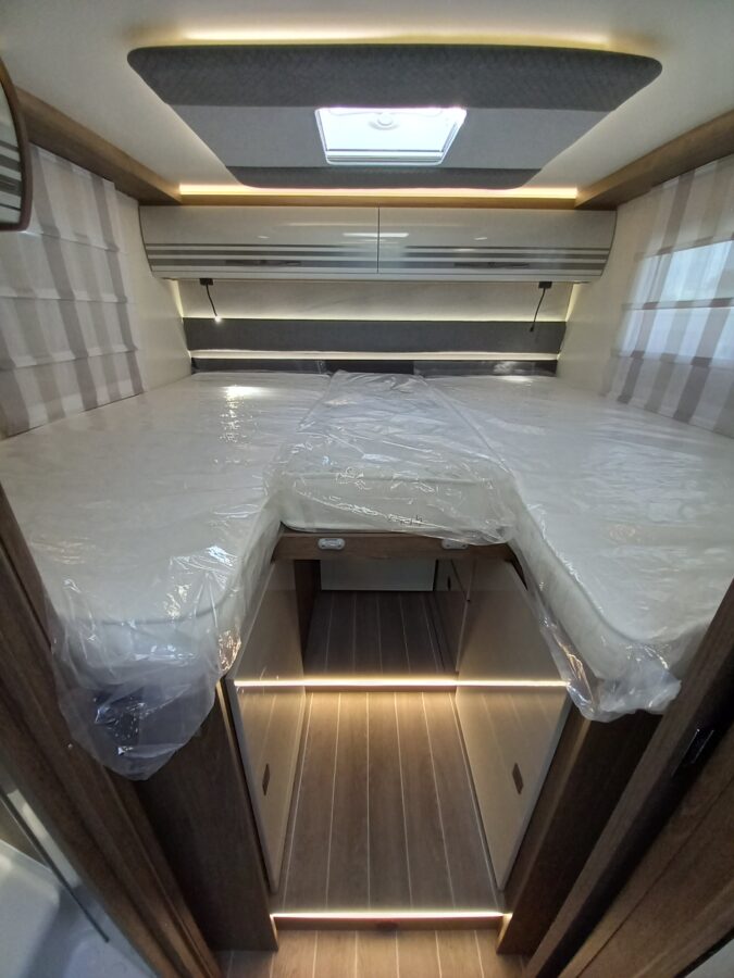 DMC 3500kg, szerszy rozstaw osi, START&STOP, ABS + ESP, 100% LED światła tylne, tempomat z limiterem prędkości, poduszka powietrzna kierowcy i pasażera, klimatyzacja automatyczna, lusterka boczne z odmrażaniem, radio DAB z 12” ekranem z Apple CarPlay / AndroidAuto, 70L zbiornik oleju napędowego, zestaw naprawczy koła, 16” stalowe koła, kabina w białym kolorze, światła przeciwmgielne, elektryczny hamulec ręczny, automatyczne wycieraczki z czujnikiem deszczu, automatyczne reflektory, światła dzienne halogenowe, kamera cofania, FORD emergency service, system CMBS (system ograniczający skutki kolizji), system monitorowania pasa ruchu, system rozpoznawania znaków prędkości, Wrong-Way system, przednie czujniki parkowania, TPMS – system monitorowania ciśnienia w oponach, 8” pół-cyfrowy panel komputera pokładowego, elektrycznie regulowane łóżko opuszczane w części salonu, okna SEITZ, gniazda USB w części salonu i sypialni, gniazdo 220V w garażu, drzwi XL z oknem i moskiterią z jednym punktem ryglowania, 2 palnikowa kuchenka gazowa, lodówka kompresorowa o pojemności 158L, ogrzewanie Truma Gas Combi C6, TRUMA INET X, pokrywa zlewu / deska do krojenia, szuflada CarGo w kuchni, schowek w podłodze, schody wejściowe ze schowkiem, drzwi dzielące część dzień / noc, szuflady pod łóżkiem tylnym (poza 295/95, 266/66), uchwyt na ubrania pod prysznicem (poza 285/85), izolowany zbiornik szarej wody i rury zewnętrzne, dedykowane miejsce na ekpres do kawy, termiczne zaciemnienia kabiny, okno panoramiczne, możliwość połączenia łóżek pojedynczych, dostęp do garażu z części dziennej (tylko 295/95, 285/85, 287/87), pokrowce foteli w kabinie kierowcy, okna dachowe Mini Heky 40 x 40 cm, okno dachowe w łazience Mini Heky 28 x 28 cm, standardowa tapicerka Daisy (ekoskóra + materiał)