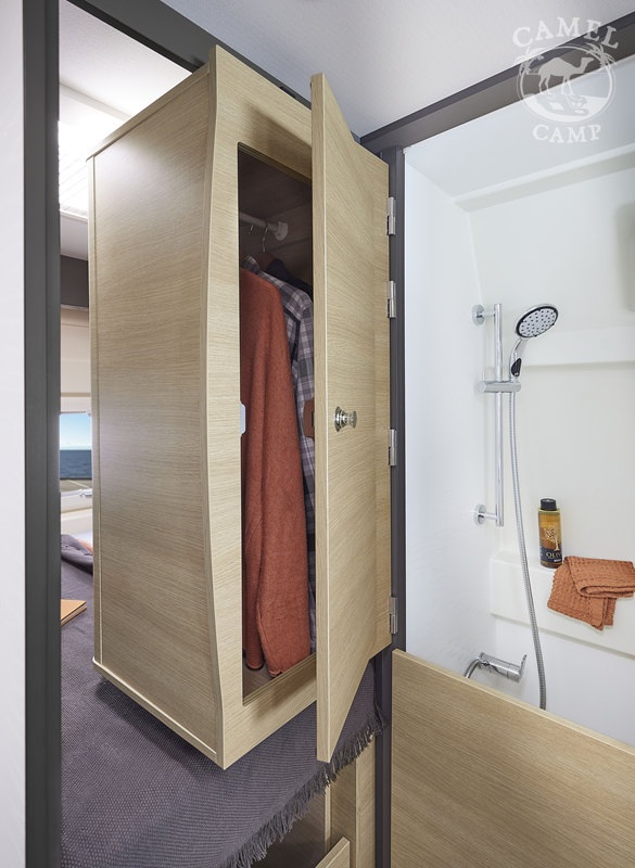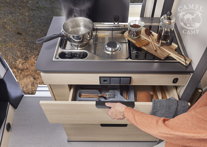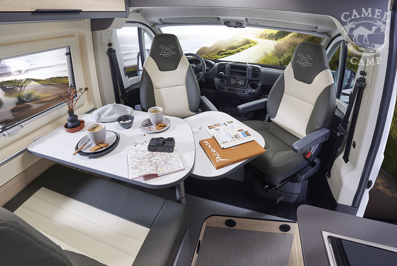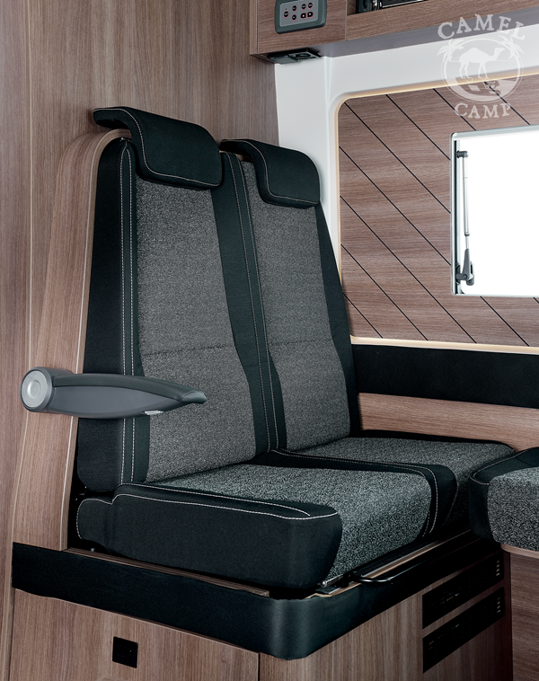 Zabudowa kempingowa: okna z podwójnymi szybami w zabudowie kempingowej, okna w tylnych drzwiach, tapicerka Origin, zamek centralny w kabinie i części mieszkalnej, regulowane obrotowe fotele z podłokietnikami, okablowanie radia (bez radia), zbiornik wyrównawczy układu wodnego zapewniający stałe ciśnienie, akumulator kempingowy AGM 92 Ah, ogrzewanie diesel Webasto 4 KW, 8 L podgrzewacz wody gazowy WHALE, przedłużenie blatu, regał na przyprawy, centralnie zamykane szuflady w kuchni, lodówka z zamrażalnikiem 149L, zbiornik wody czystej 110L, zbiornik wody szarej 85L, okablowanie i przygotowanie do montażu panelu solarnego oraz TV
