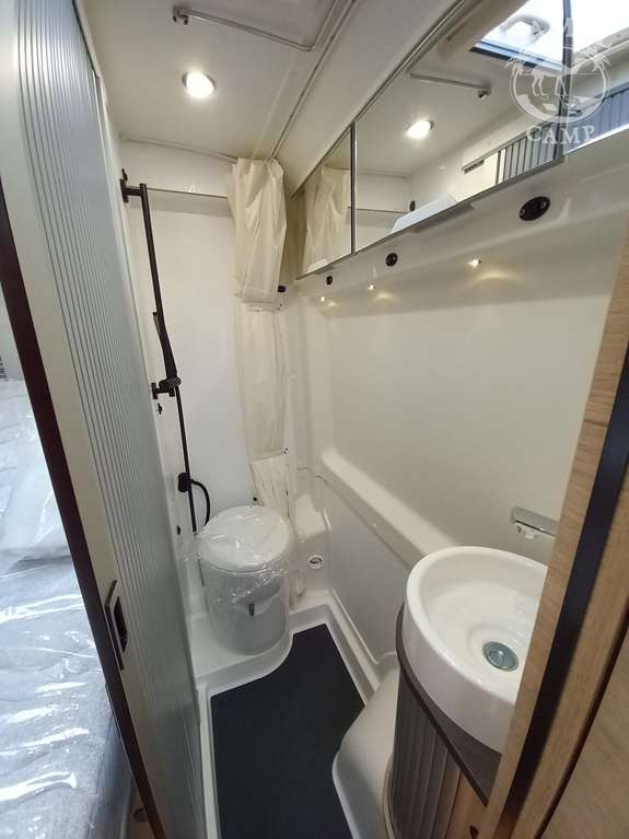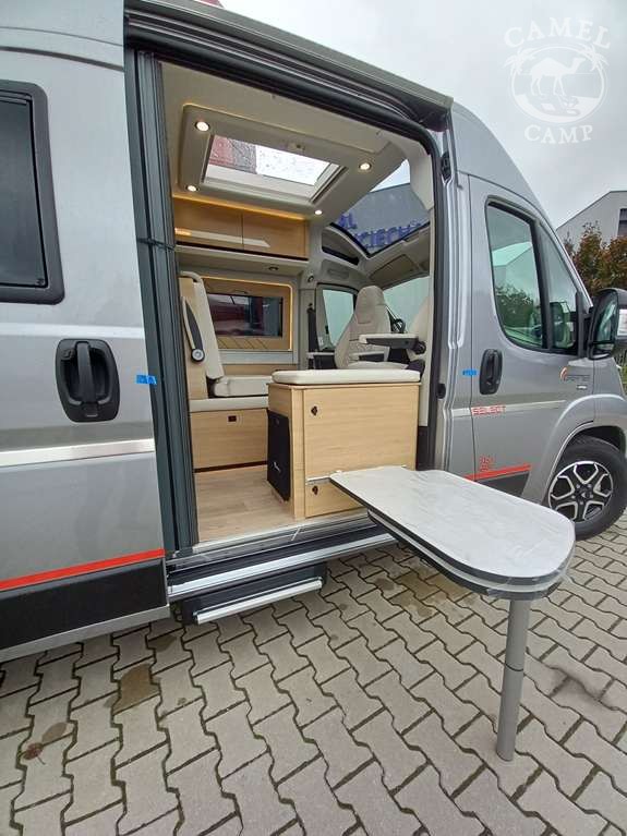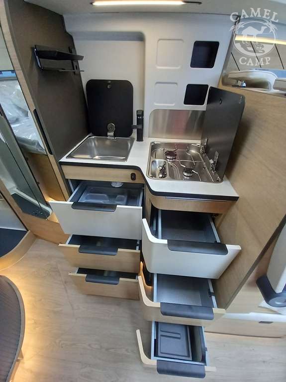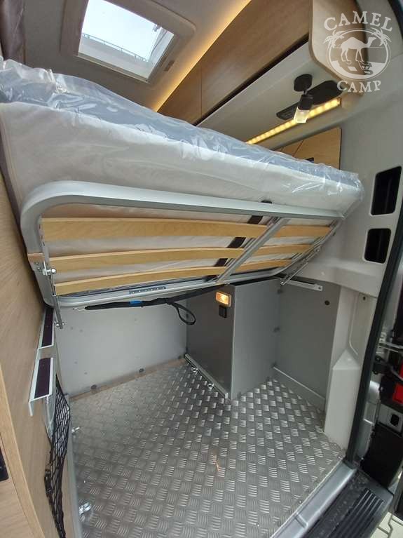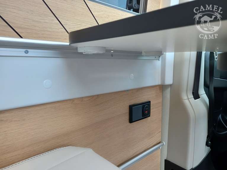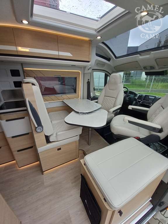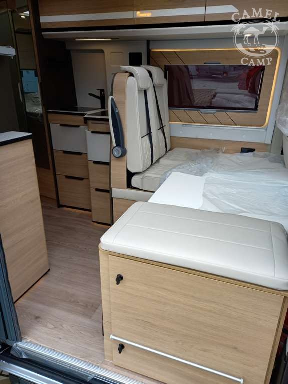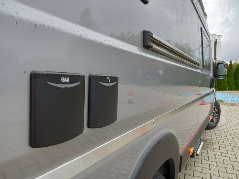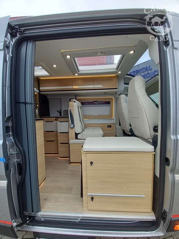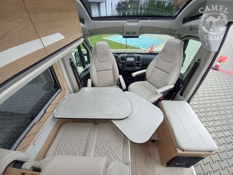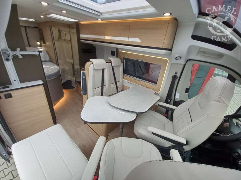 Zabudowa kempingowa: okna z podwójnymi szybami w zabudowie kempingowej, zamek centralny w kabinie i części mieszkalnej, elektryczny stopień, regulowane obrotowe fotele z podłokietnikami, oświetlenie LED wewnętrzne i zewnętrzne, 2 x akumulator kempingowy 80 Ah AGM, tryb „Coming home”, dywanik kabiny, system do podłączenia butli gazowych z czujnikiem przeciw wypadkowym, zbiornik wyrównawczy układu wodnego zapewniający stałe ciśnienie, ogrzewanie Truma Combi gas 4KW z panelem CP PLUS, meble Eclipse / Nordic, tapicerka Origin, okablowanie i przygotowanie do montażu panelu solarnego oraz TV, uchwyt na TV, regulowane zagłówki, ISOFIX, zbiornik wody czystej 110L, zbiornik wody szarej 85L, centralnie zamykane szuflady w kuchni, przedłużenie blatu, regał na przyprawy, dwa palniki gazowe, lodówka z zamrażalnikiem 146L