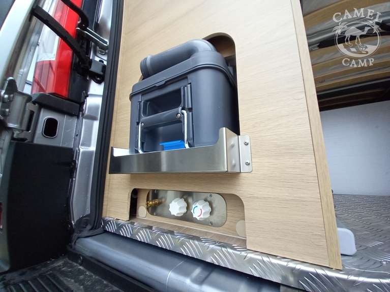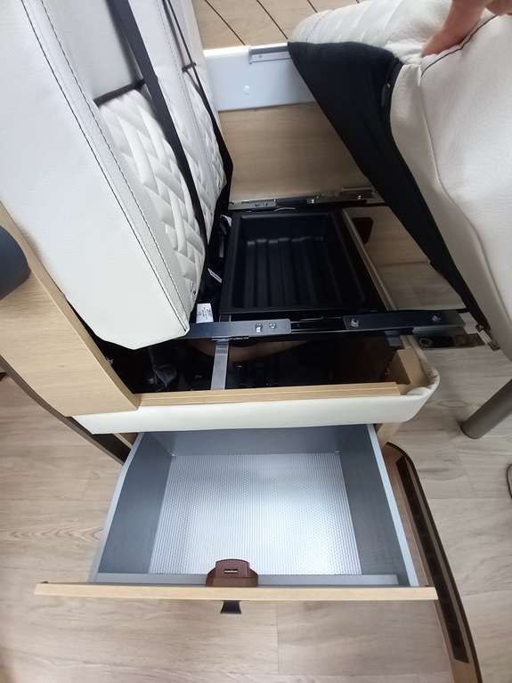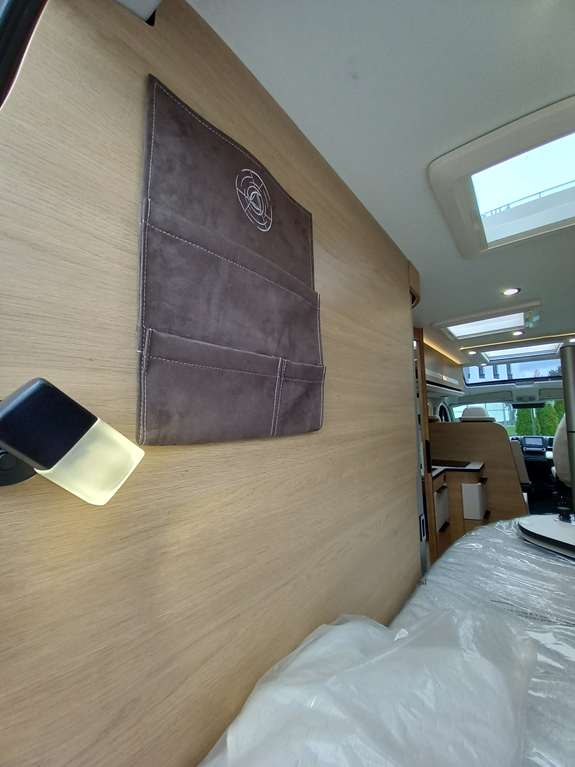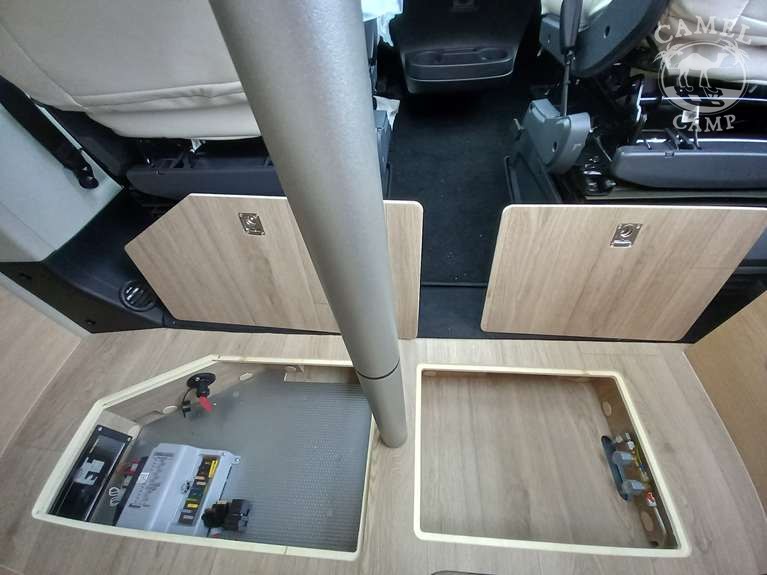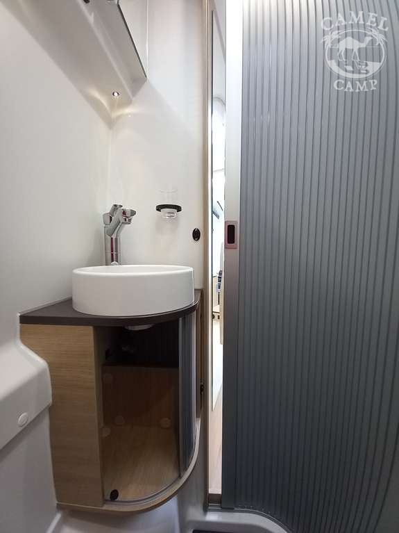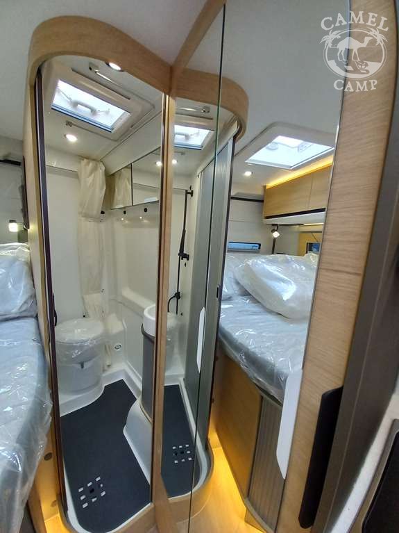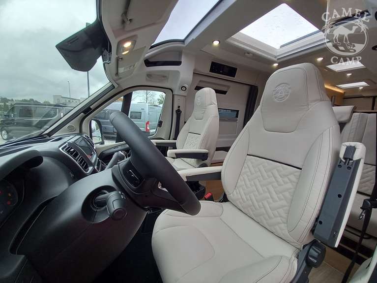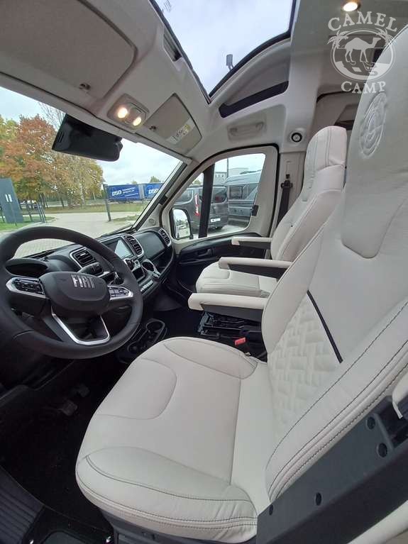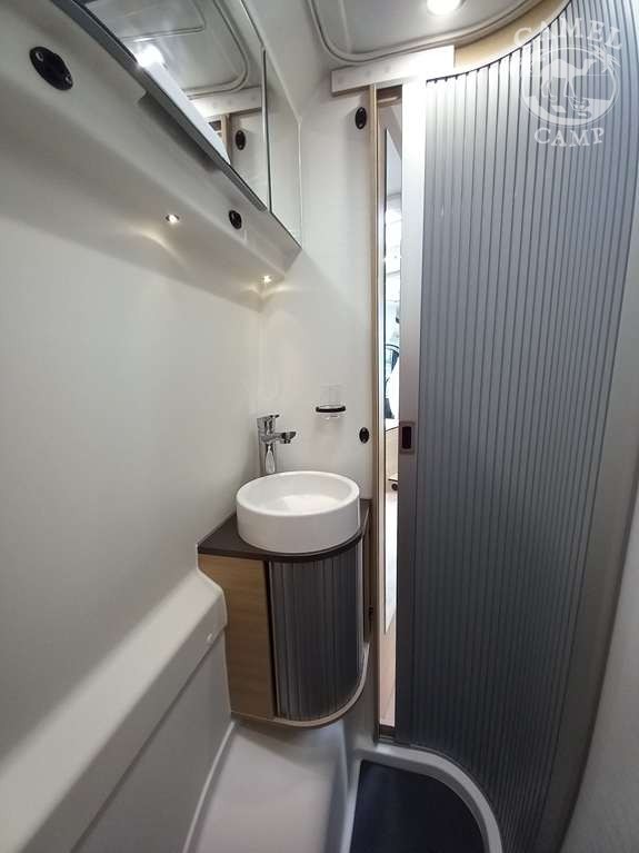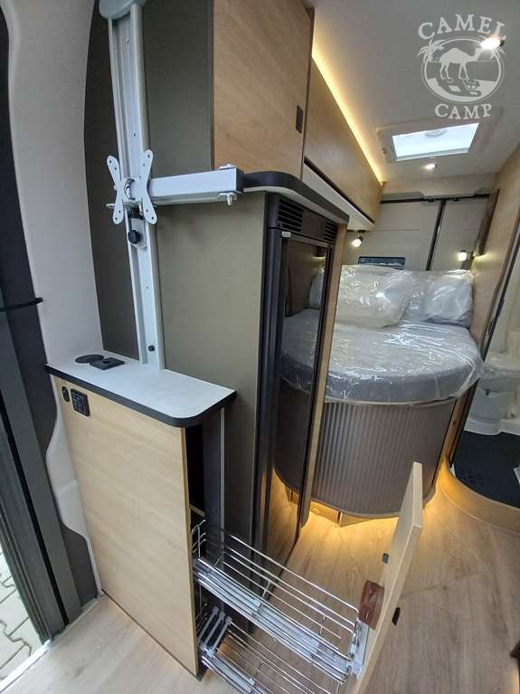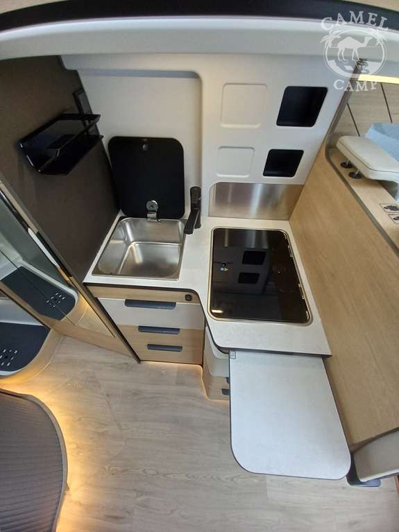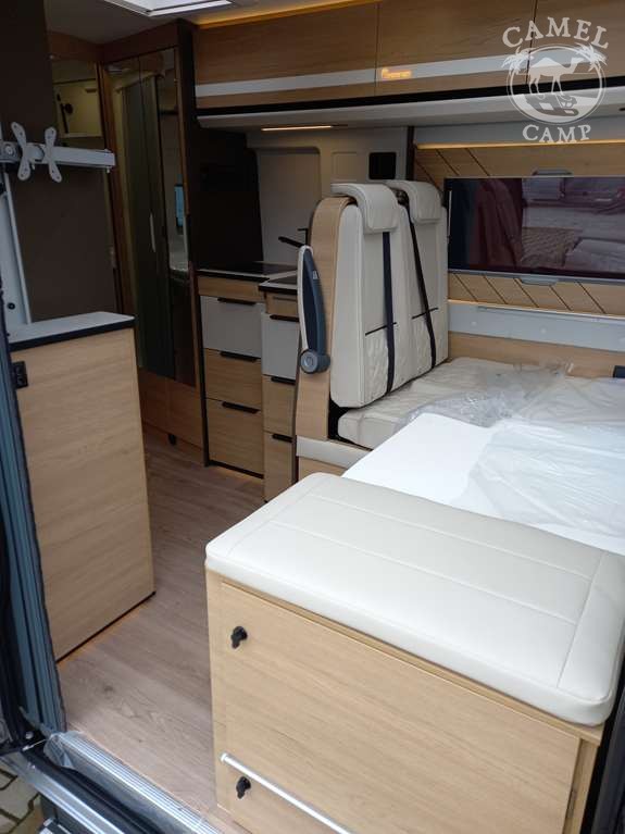 Zabudowa kempingowa: okna z podwójnymi szybami w zabudowie kempingowej, zamek centralny w kabinie i części mieszkalnej, elektryczny stopień, regulowane obrotowe fotele z podłokietnikami, oświetlenie LED wewnętrzne i zewnętrzne, 2 x akumulator kempingowy 80 Ah AGM, tryb „Coming home”, dywanik kabiny, system do podłączenia butli gazowych z czujnikiem przeciw wypadkowym, zbiornik wyrównawczy układu wodnego zapewniający stałe ciśnienie, ogrzewanie Truma Combi gas 4KW z panelem CP PLUS, meble Eclipse / Nordic, tapicerka Origin, okablowanie i przygotowanie do montażu panelu solarnego oraz TV, uchwyt na TV, regulowane zagłówki, ISOFIX, zbiornik wody czystej 110L, zbiornik wody szarej 85L, centralnie zamykane szuflady w kuchni, przedłużenie blatu, regał na przyprawy, dwa palniki gazowe, lodówka z zamrażalnikiem 146L