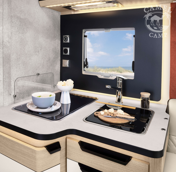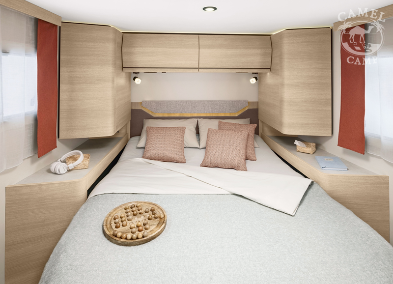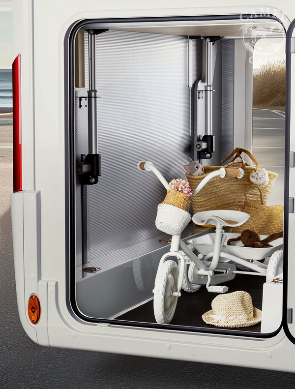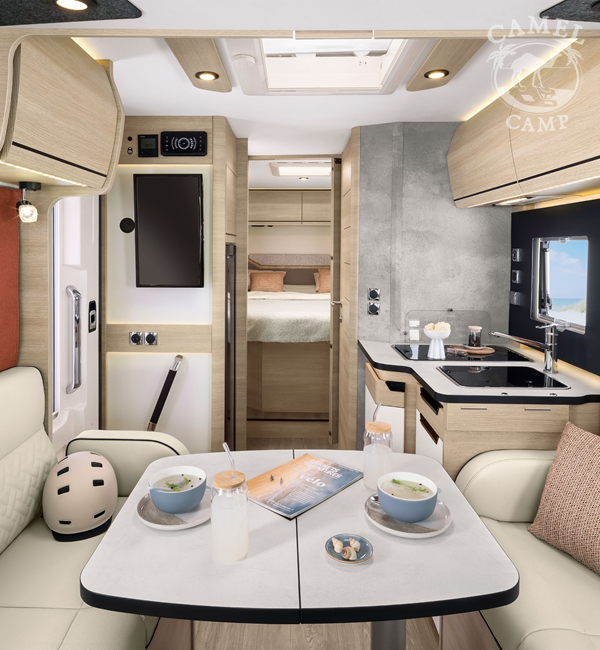 Zabudowa kempingowa: system „Coming Home”, głośniki części kempingowej, okablowanie pod TV, zbiornik wyrównujący ciśnienie, centralny zamek kabiny i drzwi kempingowych, stopień elektryczny, podwójne okna kempingowe w ramie z moskitierą i zaciemnieniem, duże okno dachowe 70 cm x 50 cm, okno dachowe nad łóżkiem przednim, oświetlenie zewnętrzne nad drzwiami kempingowymi, Truma Combi Diesel 4 kW CP PLUS, 100% oświetlenie LED w części kempingowej, manualnie opuszczane łóżko nad szoferką, elektrycznie regulowane łóżko tylne (góra/dół ok 20 cm), magnetyczne zaczepy oparć, poszerzenie blatu kuchennego, samozamykające się szuflady kuchni z centralnym zamknięciem, 2 palnikowa kuchenka, drzwi kempingowe o szerokości 54 cm, lodówka kompresorowa 149l, zbiornik wody czystej 120l, zbiornik wody szarej 90l