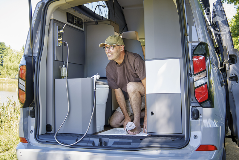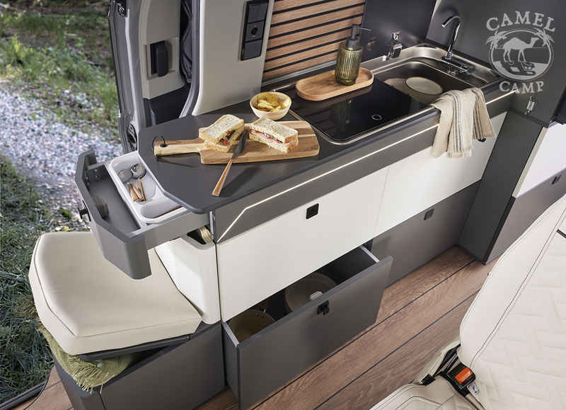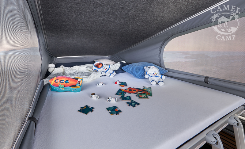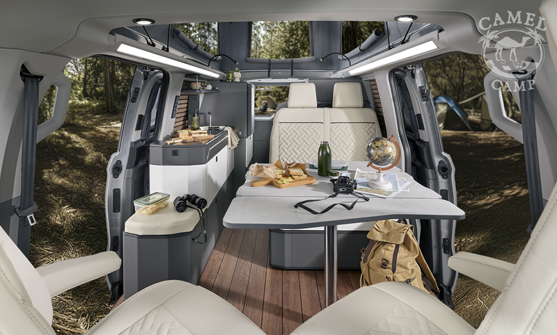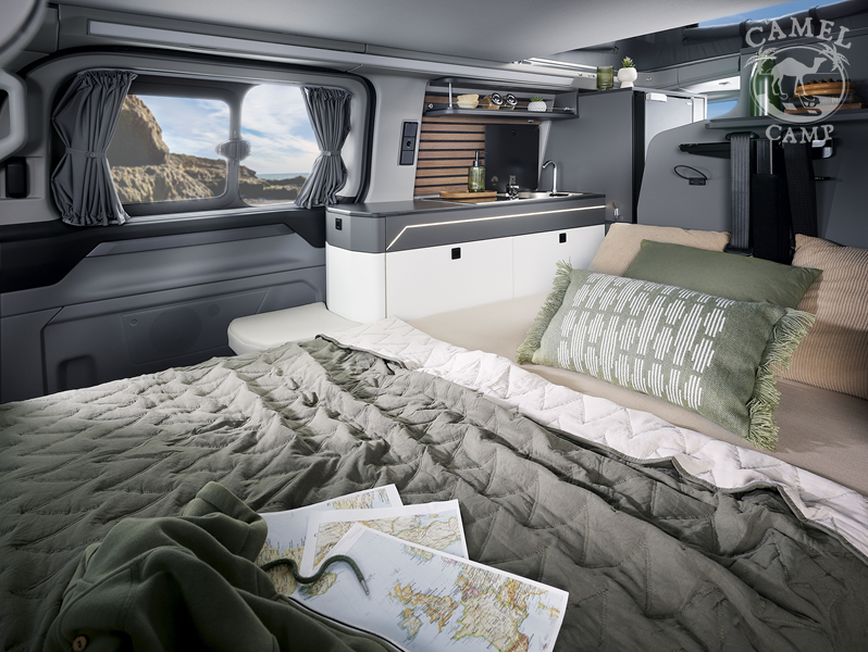 Zabudowa kempingowa: maty izotermiczne na szyby w szoferce z przyssawkami, podnoszony dach z łóżkiem dwuosobowym, meble „URBAN”, tapicerka „JAVA”, okablowanie pod instalację panelu solarnego, centralnie zamykane szuflady w kuchni, oświetlenie wewnętrzne LED, 1 x ISOFIX, kuchenka gazowa 2 palnikowa, lodówka z zamrażalnikiem 51L, zbiornik wody czystej 50L, zbiornik wody szarej 50L, akumulator kempingowy 92 AGM, dywanik w szoferce