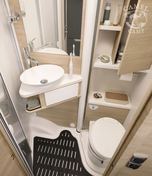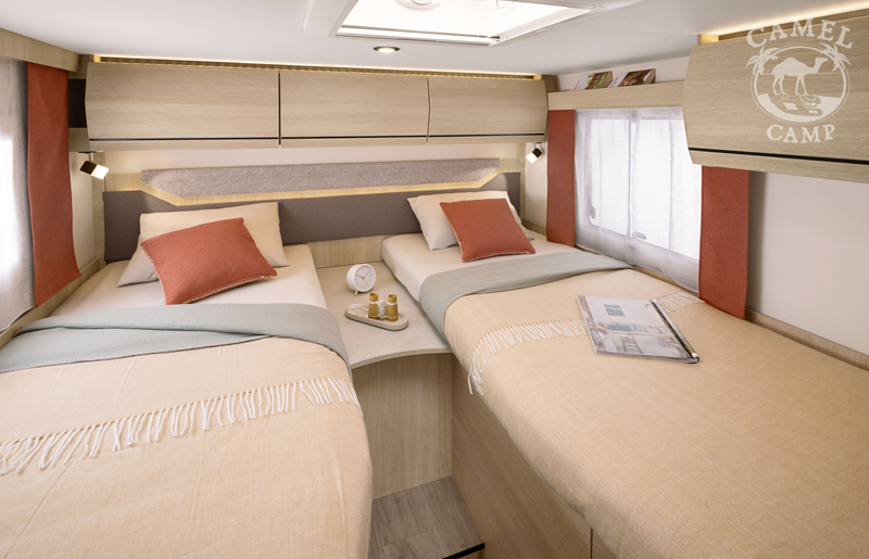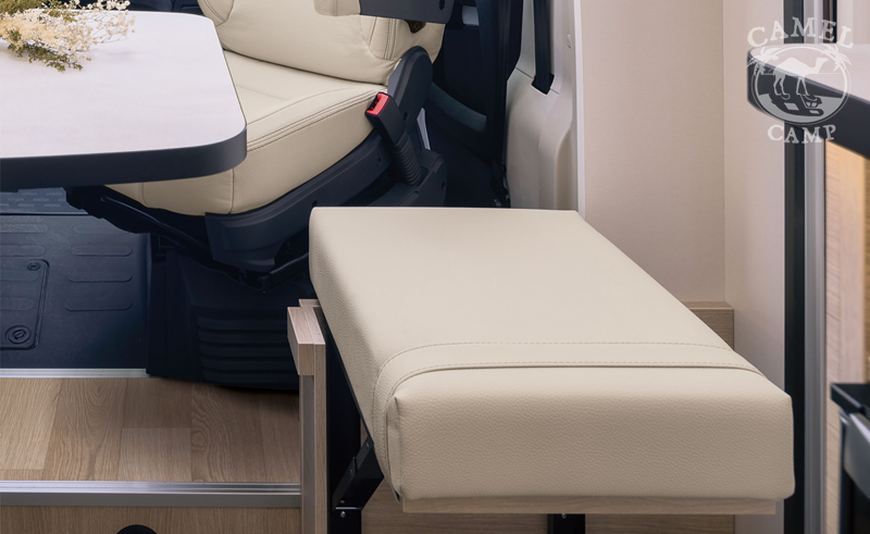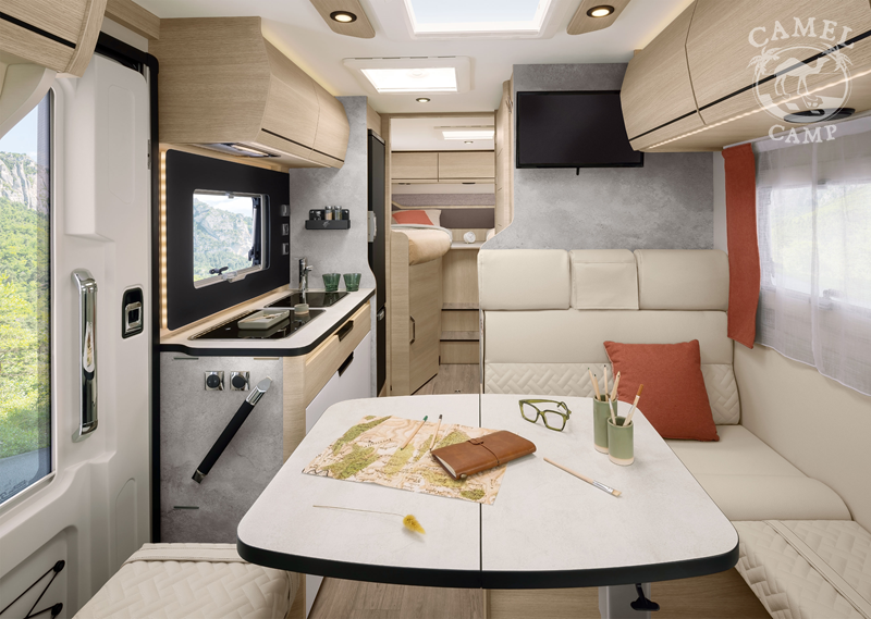 Zabudowa kempingowa: system „Coming Home”, głośniki części kempingowej, okablowanie pod TV, zbiornik wyrównujący ciśnienie, 2 x dotykowy reflektor do czytania w kabinie kierowcy, centralny zamek kabiny i drzwi kempingowych, stopień elektryczny, podwójne okna kempingowe w ramie z moskitierą i zaciemnieniem, okno panoramiczne SKYVIEW, duże okno dachowe 70 cm x 50 cm, oświetlenie zewnętrzne nad drzwiami kempingowymi, Truma Combi Diesel 4 kW CP PLUS, 100% oświetlenie LED w części kempingowej, dodatkowe łóżko w salonie, opuszczana noga stołu w salonie, magnetyczne zaczepy oparć, poszerzenie blatu kuchennego, samozamykające się szuflady kuchni z centralnym zamknięciem, 2 palnikowa kuchenka, drzwi kempingowe o szerokości 54 cm, lodówka kompresorowa 140l, zbiornik wody czystej 110l, zbiornik wody szarej 90l