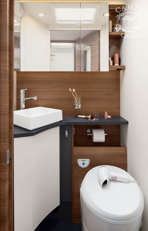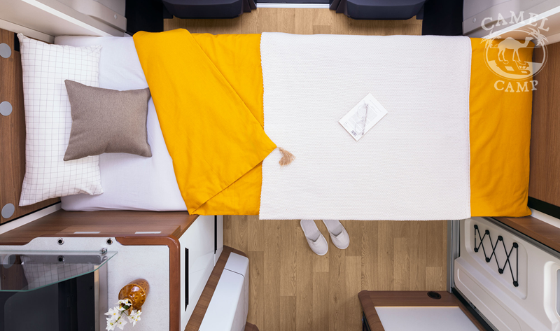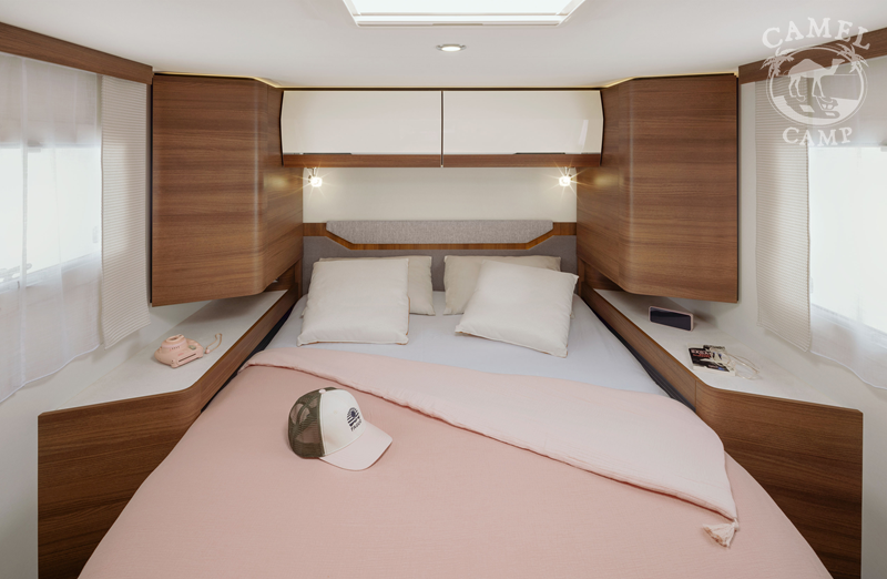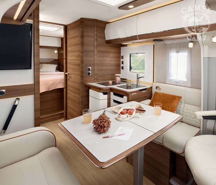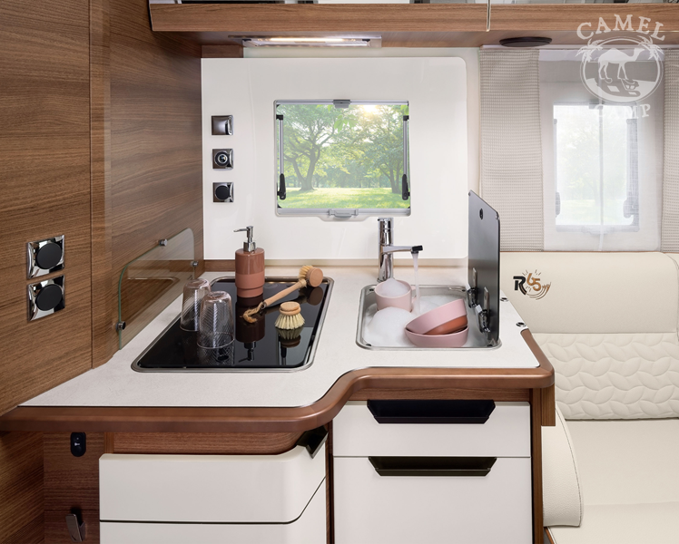 Zabudowa kempingowa: system „Coming Home”, głośniki części kempingowej, okablowanie pod TV, zbiornik wyrównujący ciśnienie, 2 x dotykowy reflektor do czytania w kabinie kierowcy, centralny zamek kabiny i drzwi kempingowych, stopień elektryczny, podwójne okna kempingowe w ramie z moskitierą i zaciemnieniem, okno panoramiczne SKYVIEW, duże okno dachowe 70 cm x 50 cm, oświetlenie zewnętrzne nad drzwiami kempingowymi, Truma Combi Diesel 4 kW CP PLUS, 100% oświetlenie LED w części kempingowej, elektrycznie regulowane łóżko tylne (góra/dół ok 20 cm), dodatkowe łóżko w salonie, opuszczana noga stołu w salonie, magnetyczne zaczepy oparć, poszerzenie blatu kuchennego, samozamykające się szuflady kuchni z centralnym zamknięciem, 2 palnikowa kuchenka, drzwi kempingowe o szerokości 54 cm, lodówka kompresorowa 149l, zbiornik wody czystej 120l, zbiornik wody szarej 90l