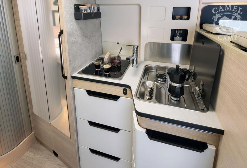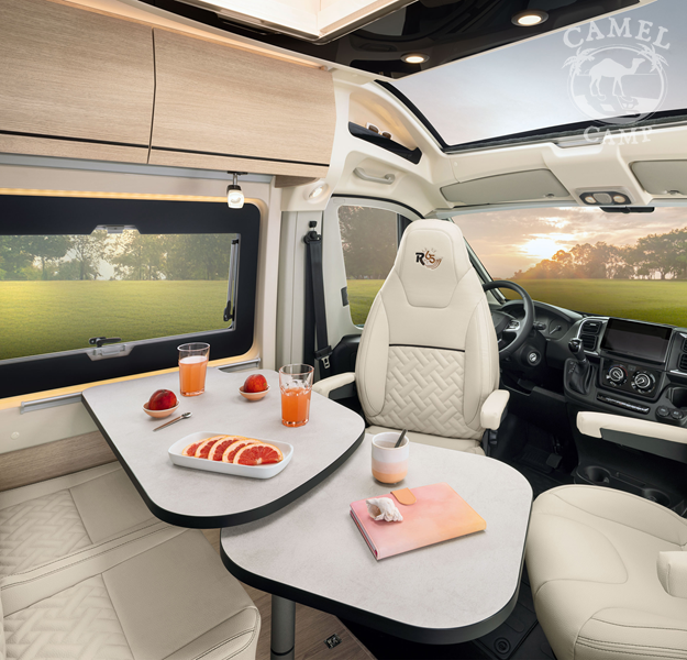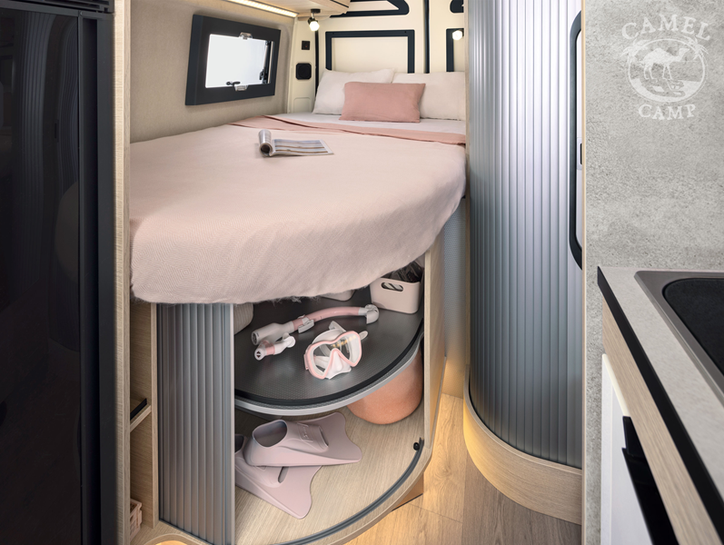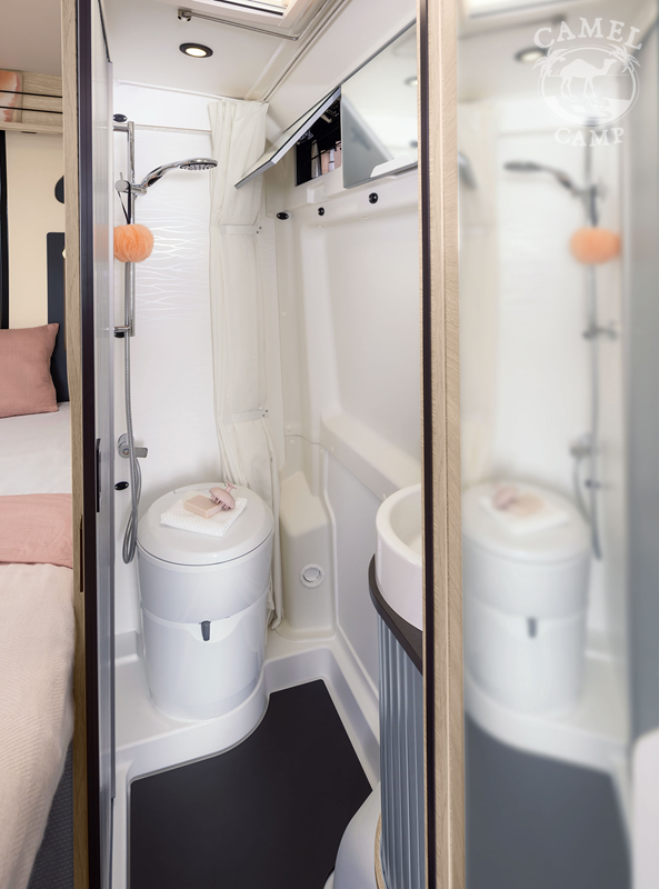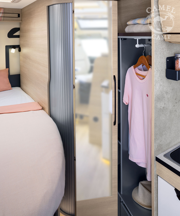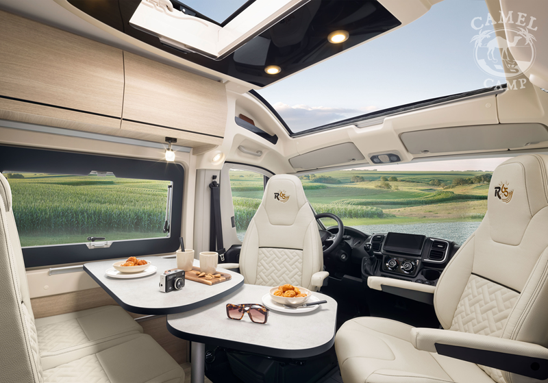 Zabudowa kempingowa: plisowane rolety okien w szoferce, 2 x akumulator kempingowy AGM 92 Ah, system „Coming Home”, głośniki części kempingowej, okablowanie pod panele solarne i TV, uchwyt na TV, zbiornik wyrównujący ciśnienie, zewnętrzny prysznic, 2 x dotykowy reflektor do czytania w kabinie kierowcy, centralny zamek kabiny i drzwi kempingowych, stopień elektryczny, podwójne okna kempingowe w ramie z moskitierą i zaciemnieniem, duże okno dachowe 70 cm x 50 cm, okna w tylnych drzwiach, oświetlenie zewnętrzne, Truma Combi Gas 4 kW CP PLUS, 100% oświetlenie LED w części kempingowej, dodatkowe łóżko w salonie, ISOFIX, poszerzenie blatu kuchennego, samozamykające się szuflady kuchni z centralnym zamknięciem, 2 palnikowa kuchenka, lodówka kompresorowa 149l, zbiornik wody czystej 110l, zbiornik wody szarej 85l