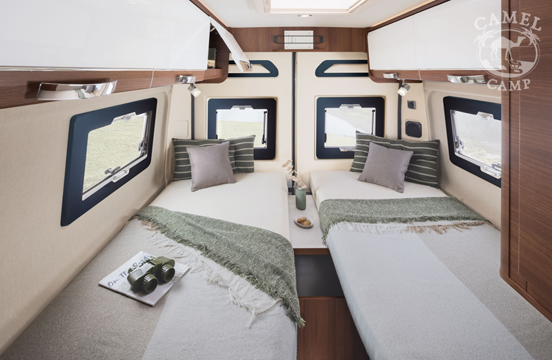 Zabudowa kempingowa: plisowane rolety okien w szoferce, 2 x akumulator kempingowy AGM 92 Ah, system „Coming Home”, głośniki części kempingowej, okablowanie pod panele solarne i TV, uchwyt na TV, zbiornik wyrównujący ciśnienie, zewnętrzny prysznic, 2 x dotykowy reflektor do czytania w kabinie kierowcy, centralny zamek kabiny i drzwi kempingowych, stopień elektryczny, podwójne okna kempingowe w ramie z moskitierą i zaciemnieniem, duże okno dachowe 70 cm x 50 cm, oświetlenie zewnętrzne, Truma Combi Gas 4 kW CP PLUS, 100% oświetlenie LED w części kempingowej, dodatkowe łóżko w salonie, ISOFIX, poszerzenie blatu kuchennego, samozamykające się szuflady kuchni z centralnym zamknięciem, 2 palnikowa kuchenka, lodówka kompresorowa 146l, zbiornik wody czystej 110l, zbiornik wody szarej 85l