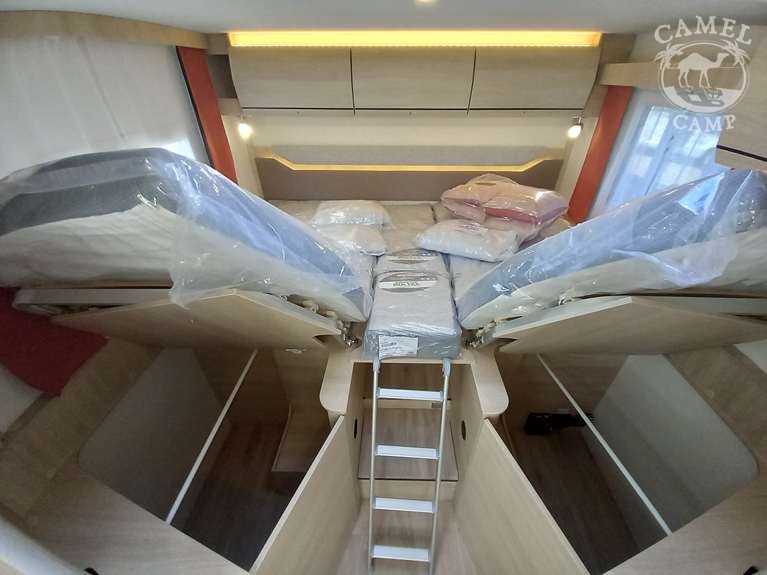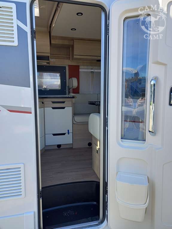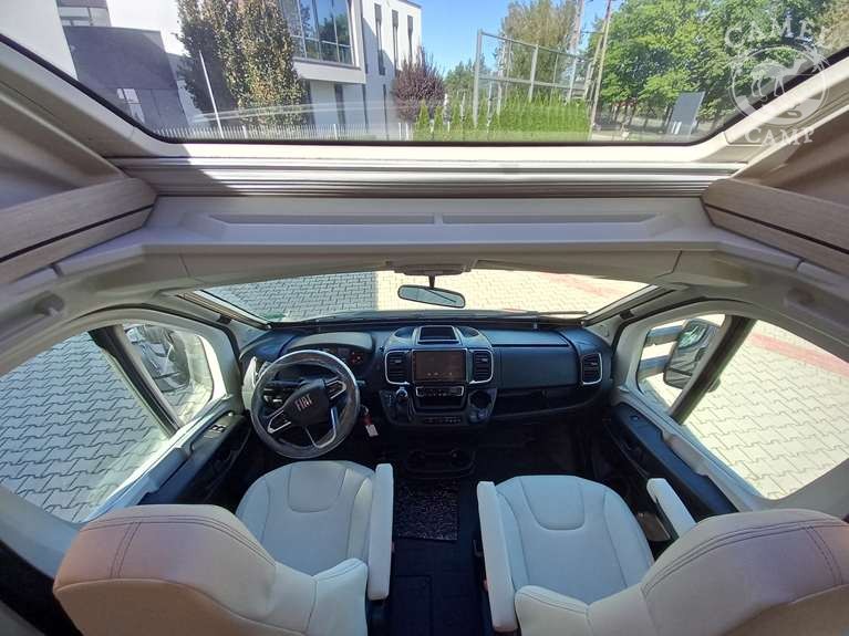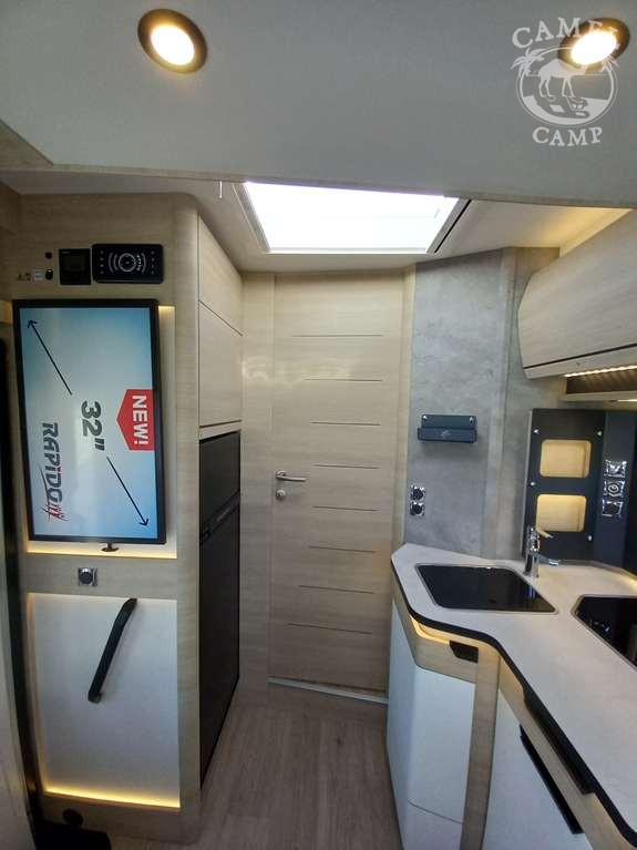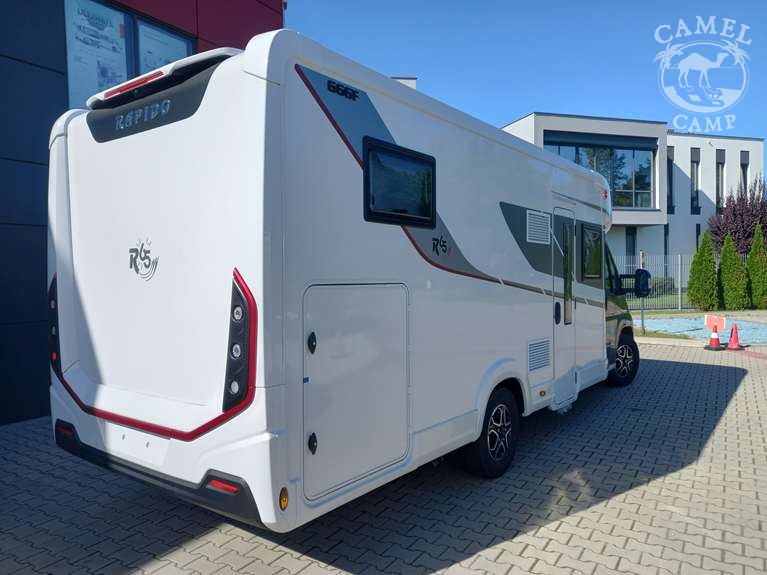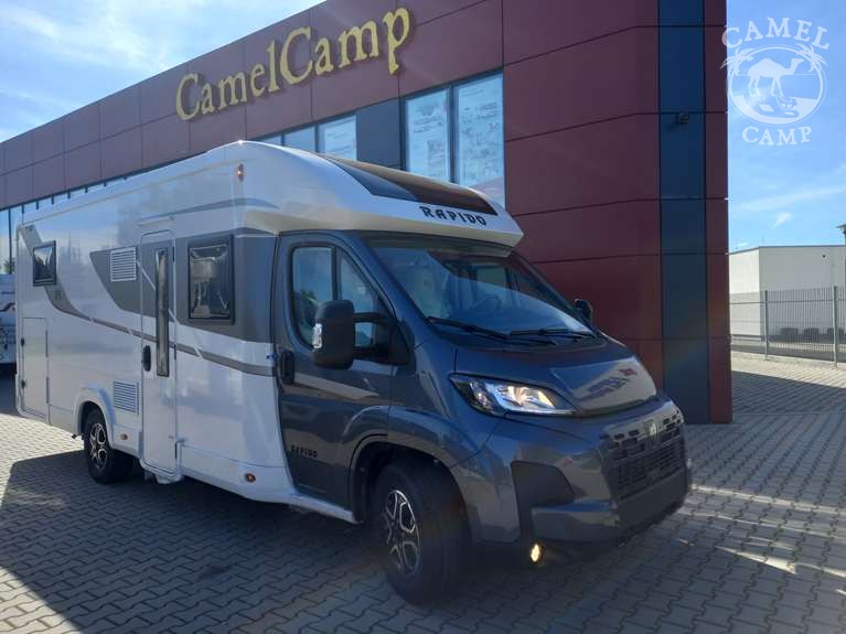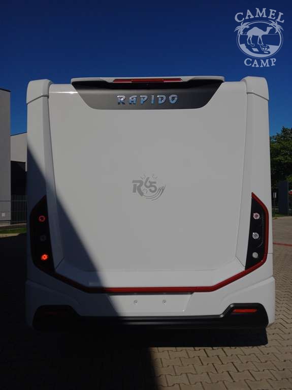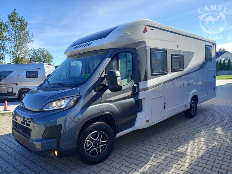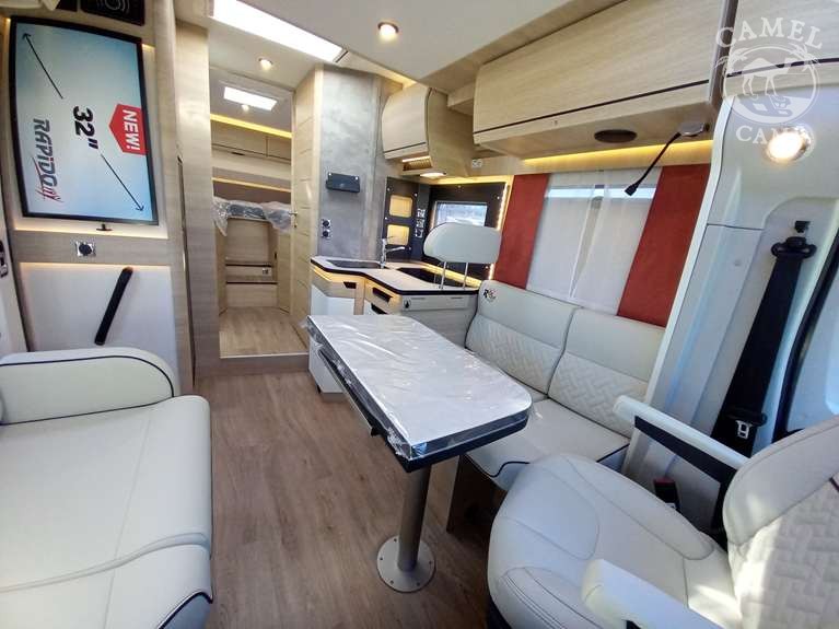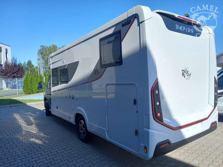 RAPIDO PACK – poduszka kierowcy, ABS, centralny zamek kabiny z dwupunktową blokadą i drzwi kempingowych, pokrowce foteli kabiny, klimatyzacja manualna, lusterka boczne z podwójnym widokiem, elektryczne okna kabiny, system „Coming Home”, pojemniki na kubki, Truma 4 CP Plus, ogrzewany i oświetlony (listwa sufitowa) garaż, porty USB lampkach, lodówka absorpcyjna z zamrażalnikiem 156L, zbiornik wody czystej 120l, zbiornik wody szarej 90l, 2 palnikowa kuchenka gazowa z iskrownikiem, wyciąg kuchenny, samozamykające się szuflady kuchni z centralnym zamknięciem, podświetlana ściana kuchni, regał na przyprawy i uchwyt na papier, dodatkowy blat, aluminiowe rama i listwy łóżek, miejsce na TV 32”, otwierane okna dachowe, podwójne szyby kempingowe z moskitierą i zaciemnieniem, drzwi izolujące sypialnie, zamki magnetyczne drzwi, chromowane i drewniane wykończenia łazienki, SKYVIEW z elektrycznym rozmrażaniem, zintegrowany kosz na śmieci w drzwiach kempingowych, izolowany stopień wejściowy, 100% oświetlenie LED w części kempingowej i garażu, 2 x dotykowy reflektor do czytania w kabinie kierowcy, magnetyczne mocowania oparć kanap, poszerzenie blatu kuchennego, wieszak do suszenia ubrań, materac piankowy BULTEX® w tylnym łóżku