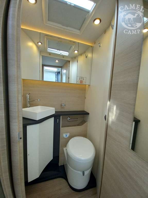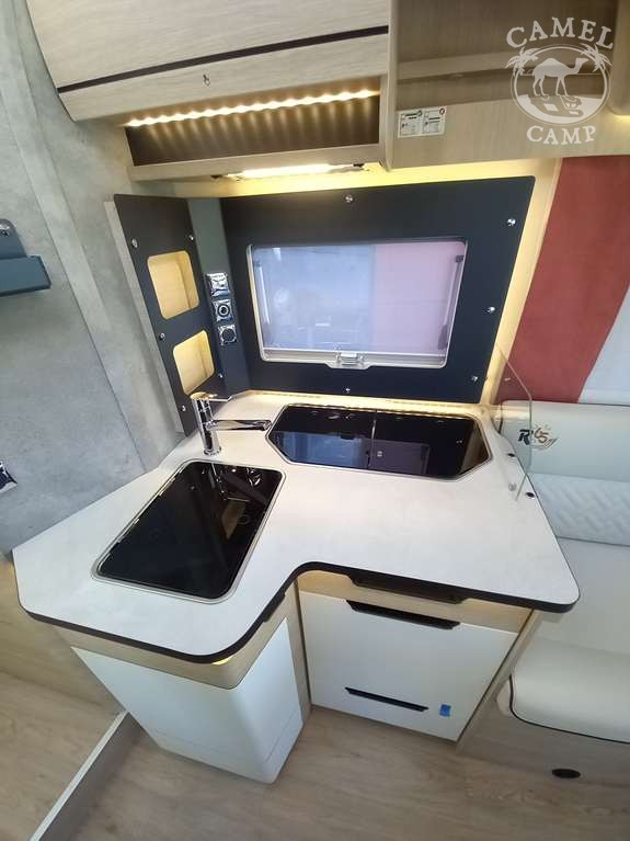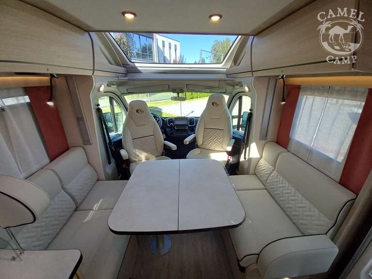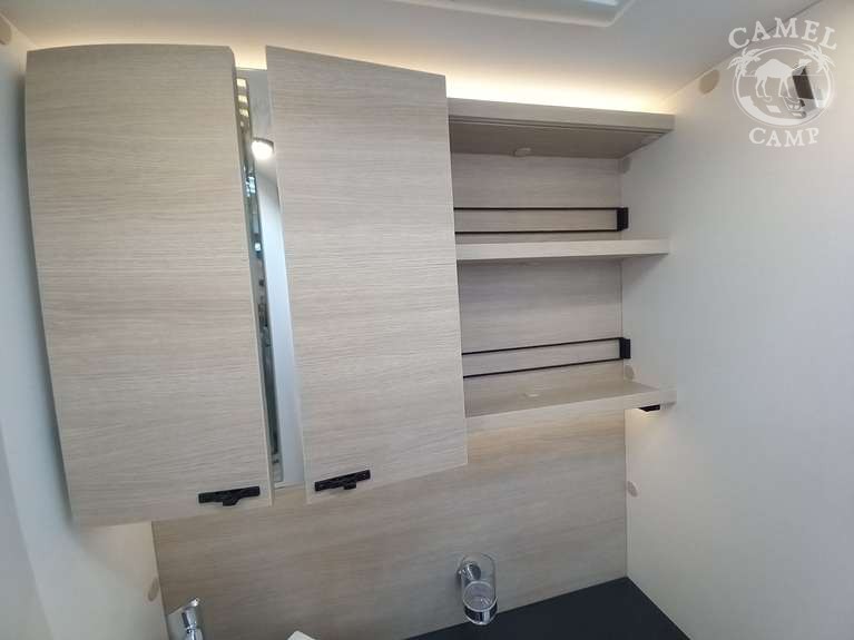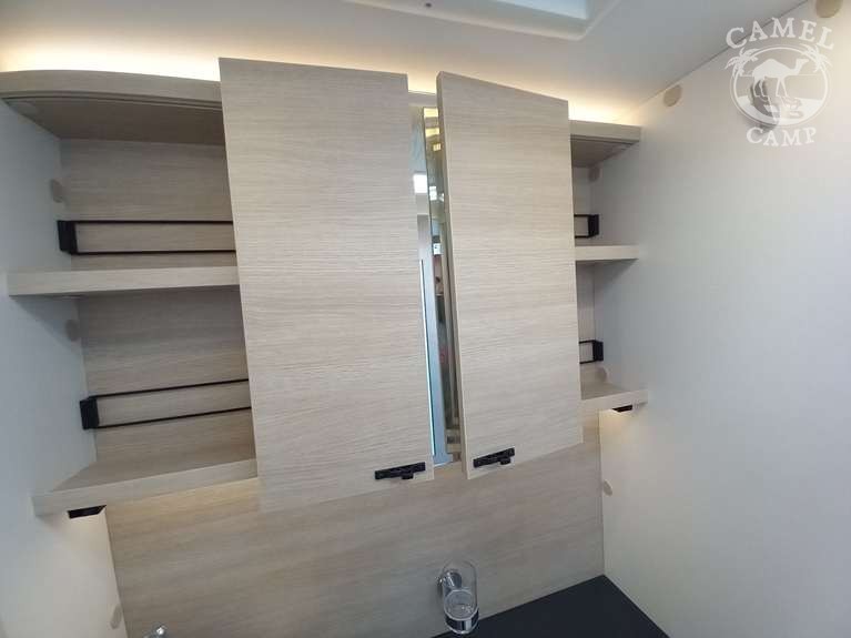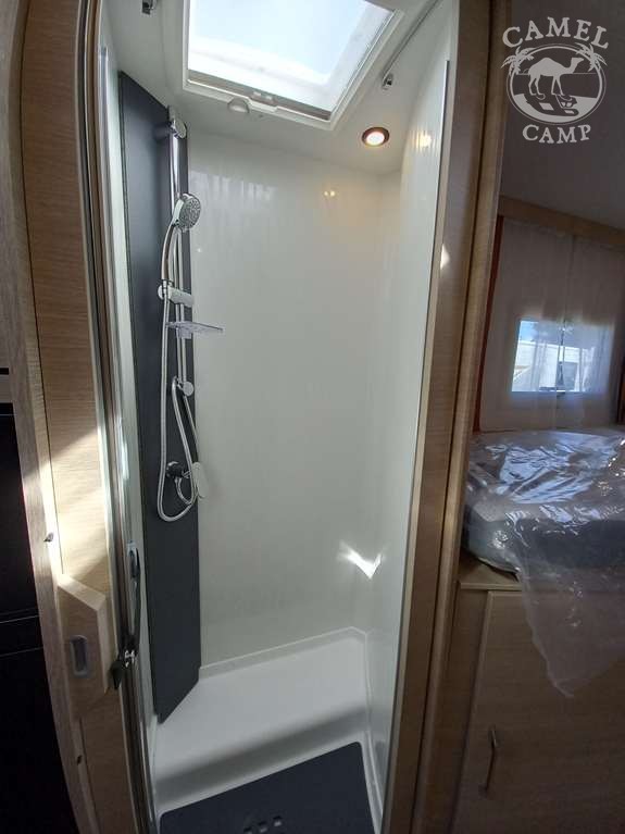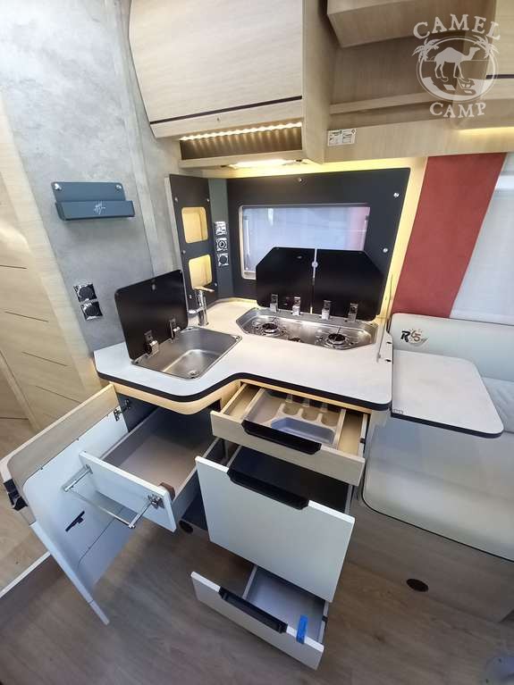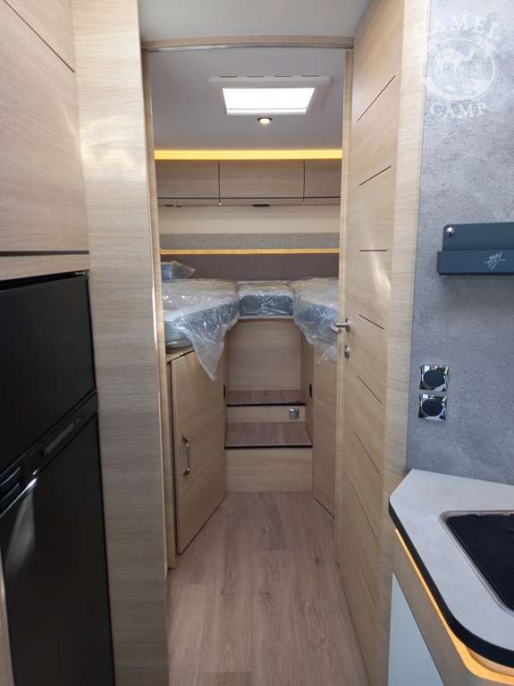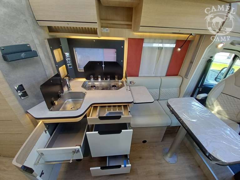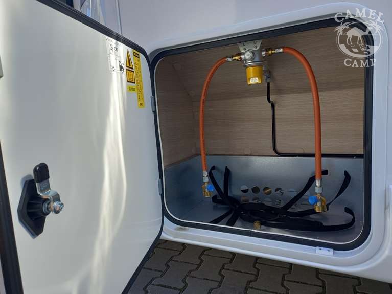 RAPIDO PACK – poduszka kierowcy, ABS, centralny zamek kabiny z dwupunktową blokadą i drzwi kempingowych, pokrowce foteli kabiny, klimatyzacja manualna, lusterka boczne z podwójnym widokiem, elektryczne okna kabiny, system „Coming Home”, pojemniki na kubki, Truma 4 CP Plus, ogrzewany i oświetlony (listwa sufitowa) garaż, porty USB lampkach, lodówka absorpcyjna z zamrażalnikiem 156L, zbiornik wody czystej 120l, zbiornik wody szarej 90l, 2 palnikowa kuchenka gazowa z iskrownikiem, wyciąg kuchenny, samozamykające się szuflady kuchni z centralnym zamknięciem, podświetlana ściana kuchni, regał na przyprawy i uchwyt na papier, dodatkowy blat, aluminiowe rama i listwy łóżek, miejsce na TV 32”, otwierane okna dachowe, podwójne szyby kempingowe z moskitierą i zaciemnieniem, drzwi izolujące sypialnie, zamki magnetyczne drzwi, chromowane i drewniane wykończenia łazienki, SKYVIEW z elektrycznym rozmrażaniem, zintegrowany kosz na śmieci w drzwiach kempingowych, izolowany stopień wejściowy, 100% oświetlenie LED w części kempingowej i garażu, 2 x dotykowy reflektor do czytania w kabinie kierowcy, magnetyczne mocowania oparć kanap, poszerzenie blatu kuchennego, wieszak do suszenia ubrań, materac piankowy BULTEX® w tylnym łóżku