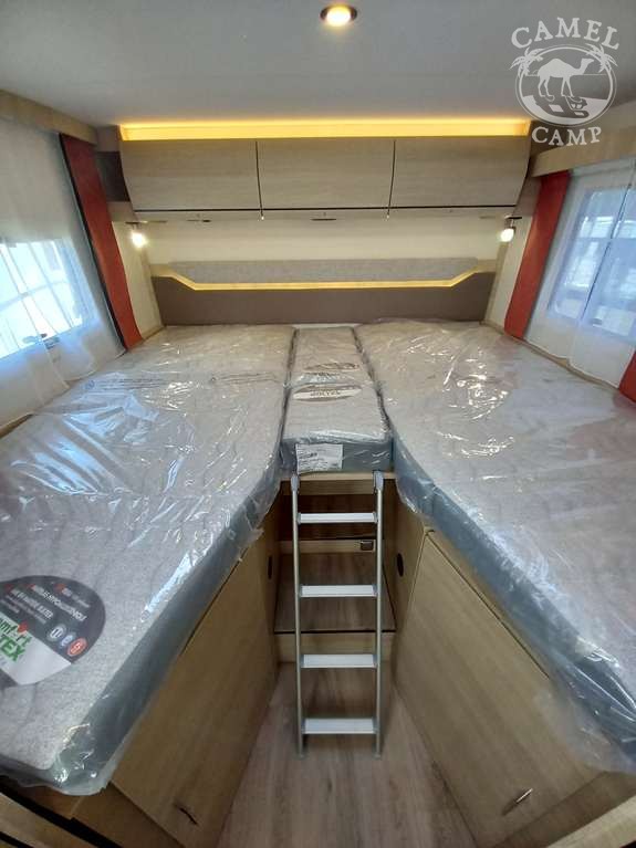 PACK 65 EDITION: specjalna dekoracja zewnętrzna 65 EDITION, lakier zewnętrzny szoferki IRON GREY (półintegra i VAN), tapicerka PALMA lub NOUMEA, hafty 65 EDITION, poduszki 65 EDITION, mata wejściowa z haftem 65 EDITION (696F i 666F), podświetlany zagłówek w sypialni, ogrzewany zbiornik wody szarej, radio PIONEER DAB 9” z funkcją APPLE CARPLAY, elektryczny hamulec ręczny, czarna deska prysznicowa, 1 x akumulator litowy 100 Ah, panel solarny 150 W