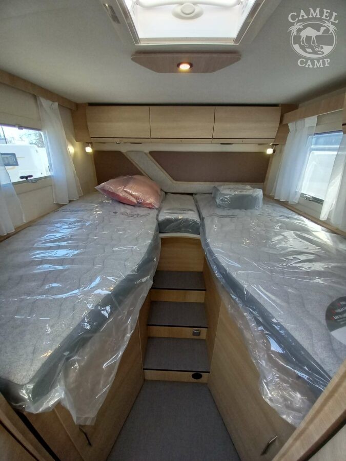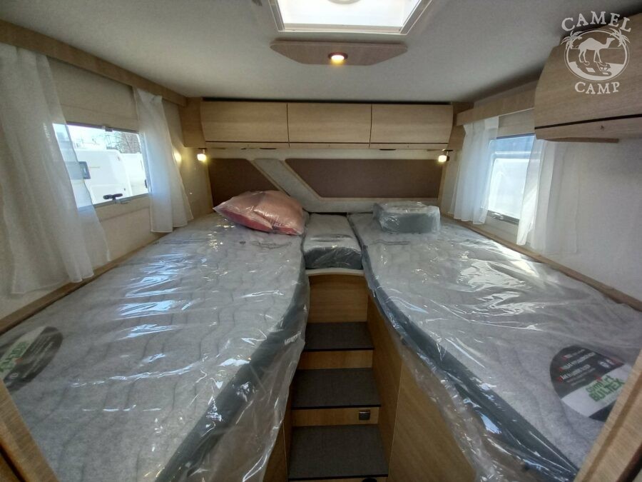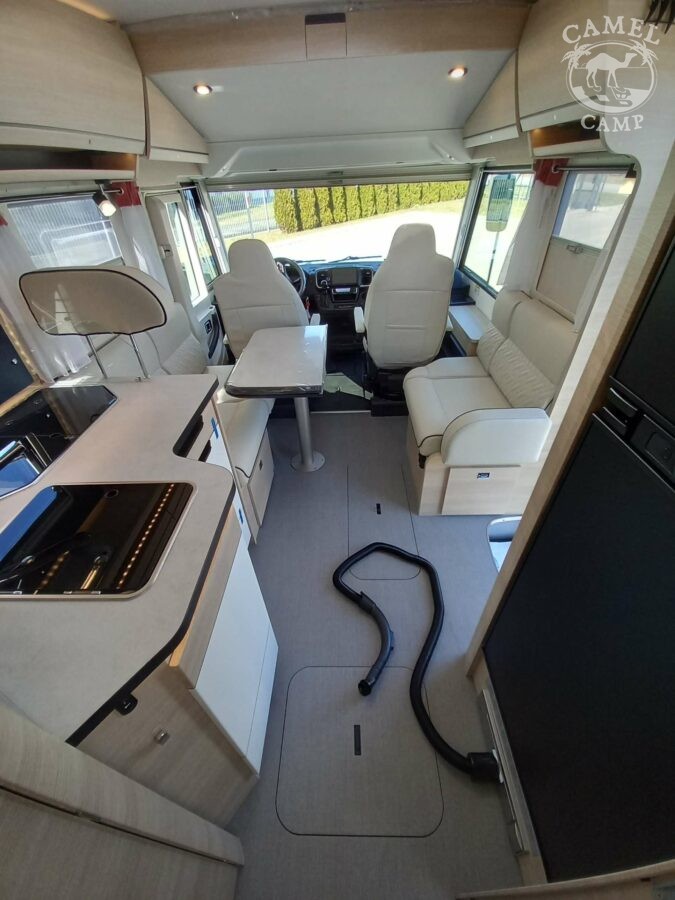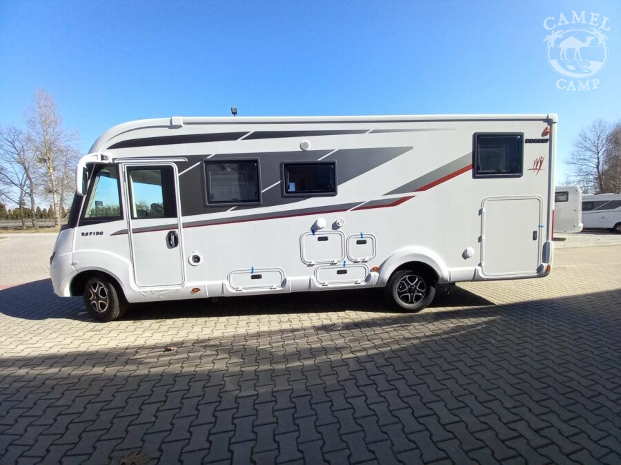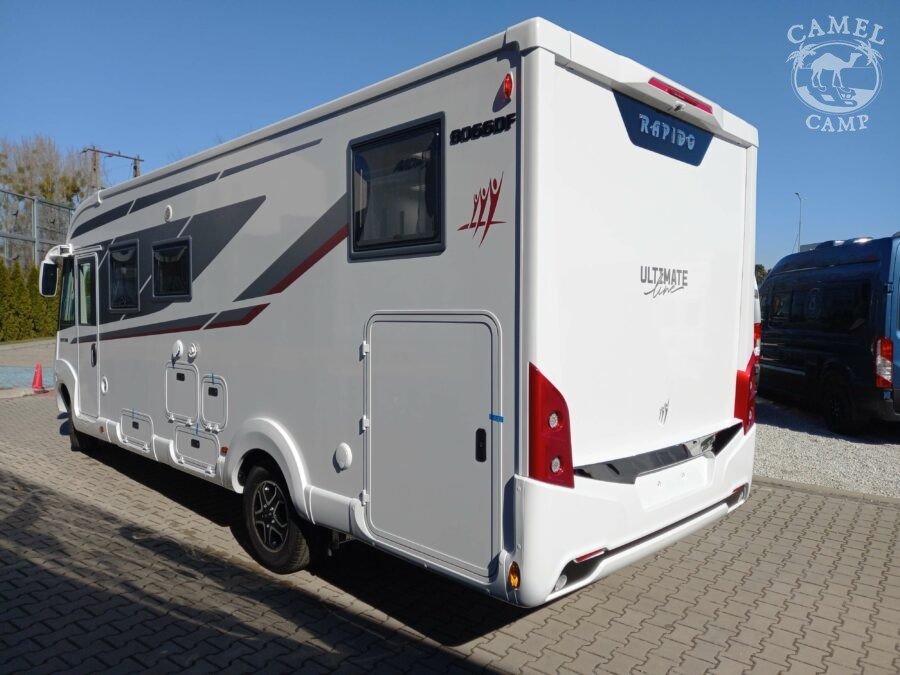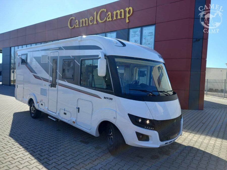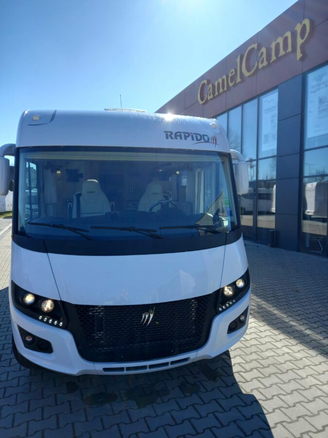 RAPIDO PACK 2025 standard – automatyczna skrzynia biegów, poduszka kierowcy, ABS, centralny zamek kabiny i drzwi kempingowych, pokrowce foteli kabiny, klimatyzacja manualna, Traction + z asystentem wjazdu, kanał grzewczy przedniej szyby (tylko gdy gas TRUMA), regulowany nawiew TRUMA w kabinie kierowcy, podwójna podłoga AL-KO, izolowany stopień wejściowy, podwójne szyby kempingowe z moskitierą i zaciemnieniem, automatycznie podświetlany stopień wejściowy przy otwarciu drzwi kempingowych, elektryczne okno kabiny, system „Coming Home”, pojemniki na kubki, ogrzewany i oświetlony (listwa sufitowa) garaż, porty USB lampkach, lodówka absorpcyjna z zamrażalnikiem 156L, zbiornik wody czystej 130l, zbiornik wody szarej 110l, 2 palnikowa kuchenka gazowa z iskrownikiem, wyciąg kuchenny, samozamykające się szuflady kuchni z centralnym zamknięciem, podświetlana ściana kuchni, regał na przyprawy i uchwyt na papier, dodatkowy blat, aluminiowe rama i listwy łóżek, miejsce na LCD 32”, druga instalacja TV / HDMI, panoramiczne otwierane okno dachowe, okna boczne w ramie, drzwi izolujące sypialnie, zamki magnetyczne drzwi, chromowane i drewniane wykończenia łazienki, elektrycznie regulowane łóżko centralne, stopień elektryczny, izolowany i ogrzewany zbiornik wody brudnej, wyciąg kuchenny, NOVABOX, wewnętrzny schowek w podłodze, schowek w podłodze na szerokość campera z dostępem od zewnątrz, 100% oświetlenie LED w części kempingowej i garażu, reflektory w części kempingowej z wbudowanym USB, magnetyczne mocowania oparć kanap, poszerzenie blatu kuchennego, wieszak do suszenia ubrań, aluminiowa rama łóżka tylnego z elastycznymi listwami, materac piankowy BULTEX® w tylnym łóżku, NOVABOX, akumulator kempingowy AGM 92 Ah, okablowanie pod panele solarne