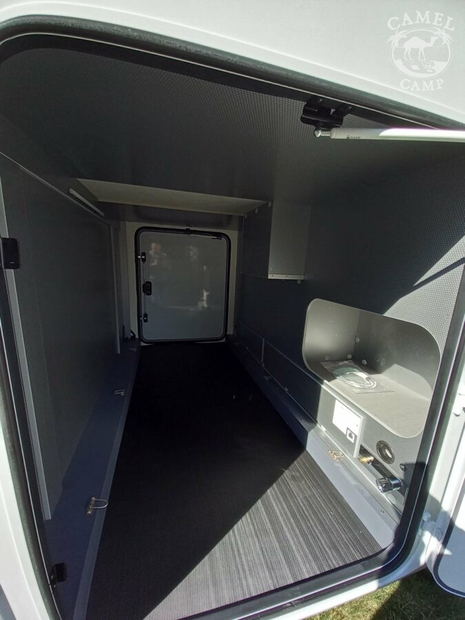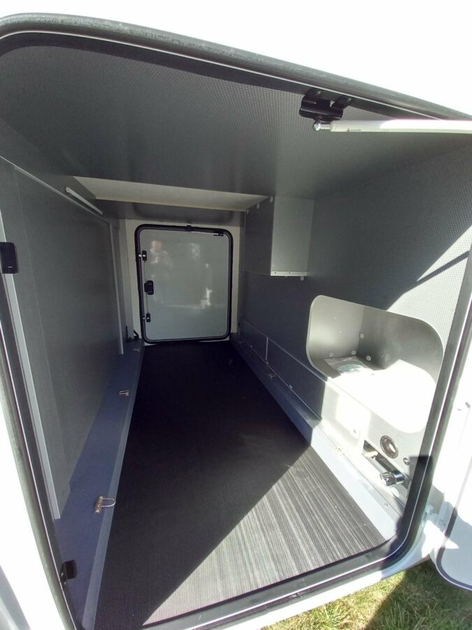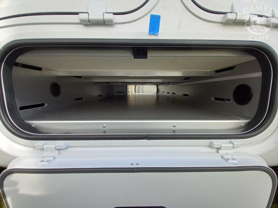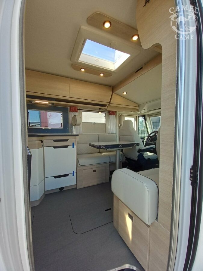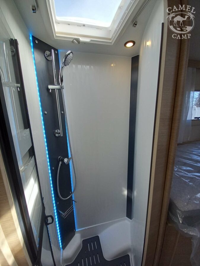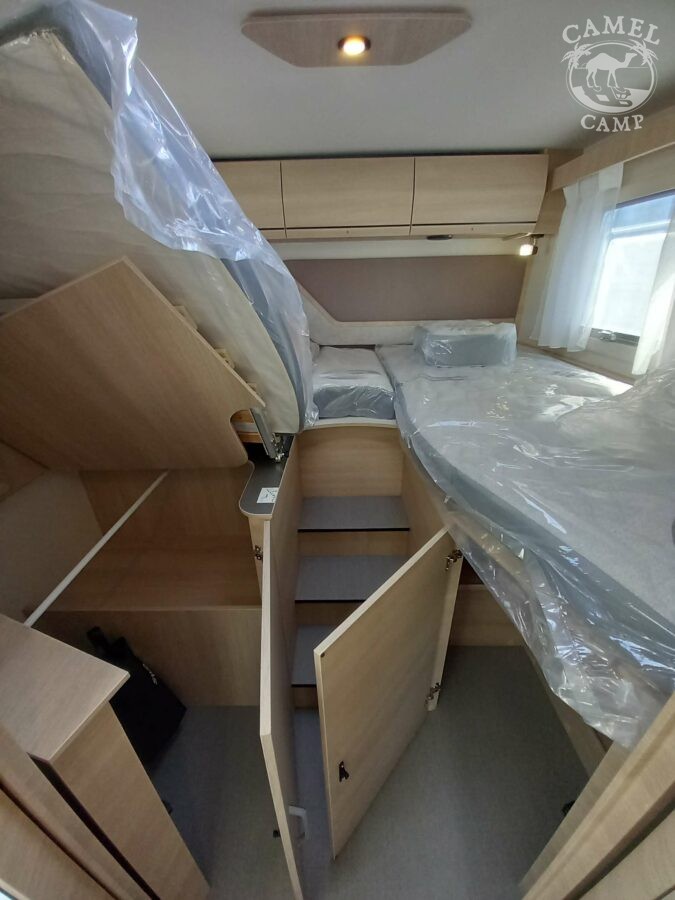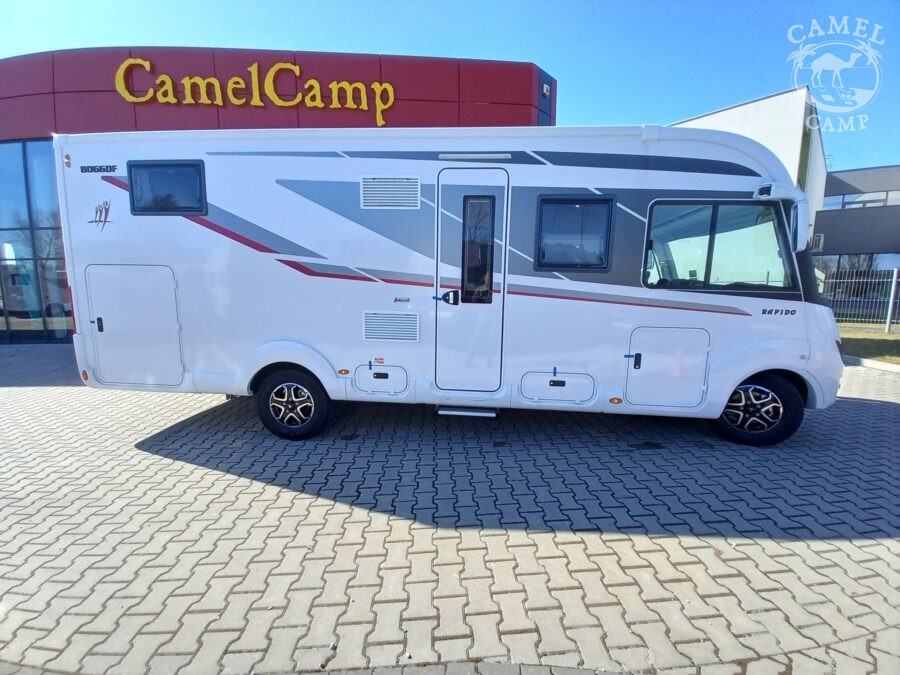 RAPIDO PACK 2025 standard – automatyczna skrzynia biegów, poduszka kierowcy, ABS, centralny zamek kabiny i drzwi kempingowych, pokrowce foteli kabiny, klimatyzacja manualna, Traction + z asystentem wjazdu, kanał grzewczy przedniej szyby (tylko gdy gas TRUMA), regulowany nawiew TRUMA w kabinie kierowcy, podwójna podłoga AL-KO, izolowany stopień wejściowy, podwójne szyby kempingowe z moskitierą i zaciemnieniem, automatycznie podświetlany stopień wejściowy przy otwarciu drzwi kempingowych, elektryczne okno kabiny, system „Coming Home”, pojemniki na kubki, ogrzewany i oświetlony (listwa sufitowa) garaż, porty USB lampkach, lodówka absorpcyjna z zamrażalnikiem 156L, zbiornik wody czystej 130l, zbiornik wody szarej 110l, 2 palnikowa kuchenka gazowa z iskrownikiem, wyciąg kuchenny, samozamykające się szuflady kuchni z centralnym zamknięciem, podświetlana ściana kuchni, regał na przyprawy i uchwyt na papier, dodatkowy blat, aluminiowe rama i listwy łóżek, miejsce na LCD 32”, druga instalacja TV / HDMI, panoramiczne otwierane okno dachowe, okna boczne w ramie, drzwi izolujące sypialnie, zamki magnetyczne drzwi, chromowane i drewniane wykończenia łazienki, elektrycznie regulowane łóżko centralne, stopień elektryczny, izolowany i ogrzewany zbiornik wody brudnej, wyciąg kuchenny, NOVABOX, wewnętrzny schowek w podłodze, schowek w podłodze na szerokość campera z dostępem od zewnątrz, 100% oświetlenie LED w części kempingowej i garażu, reflektory w części kempingowej z wbudowanym USB, magnetyczne mocowania oparć kanap, poszerzenie blatu kuchennego, wieszak do suszenia ubrań, aluminiowa rama łóżka tylnego z elastycznymi listwami, materac piankowy BULTEX® w tylnym łóżku, NOVABOX, akumulator kempingowy AGM 92 Ah, okablowanie pod panele solarne