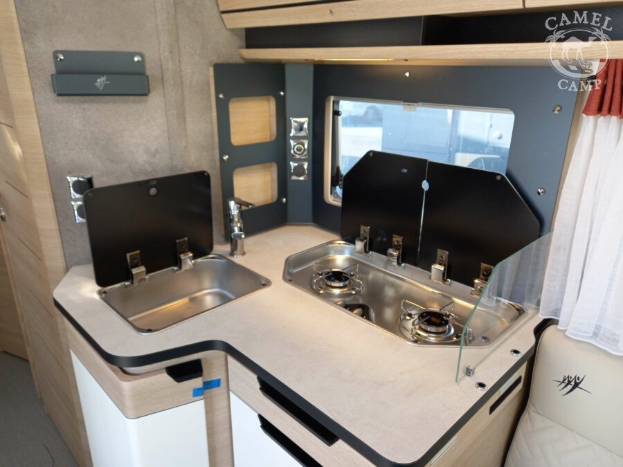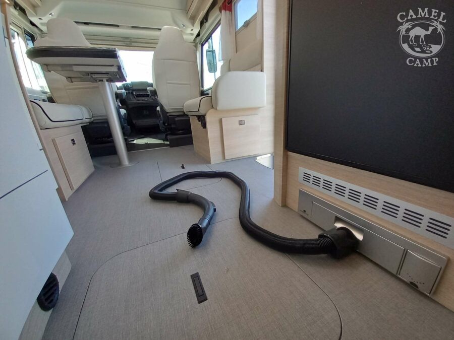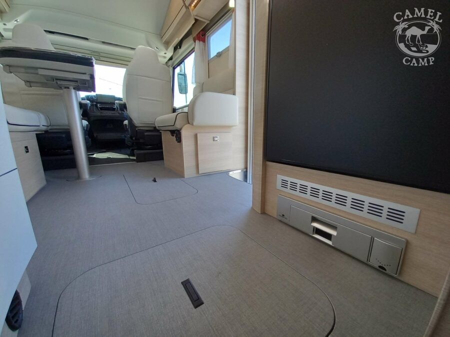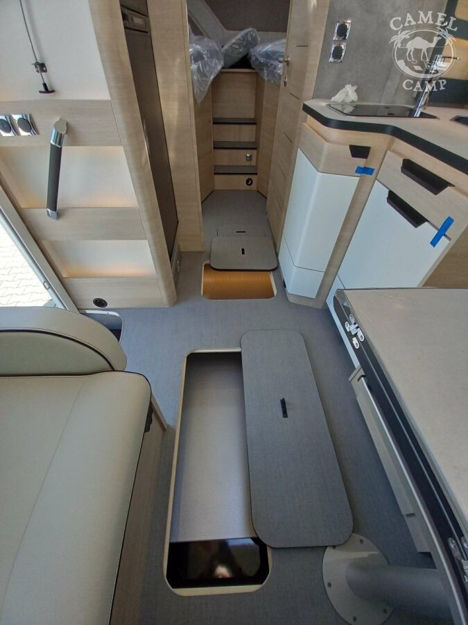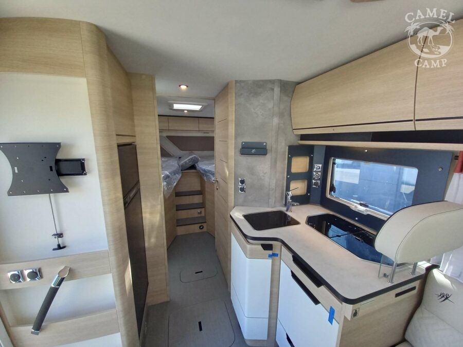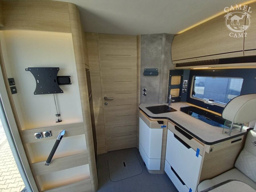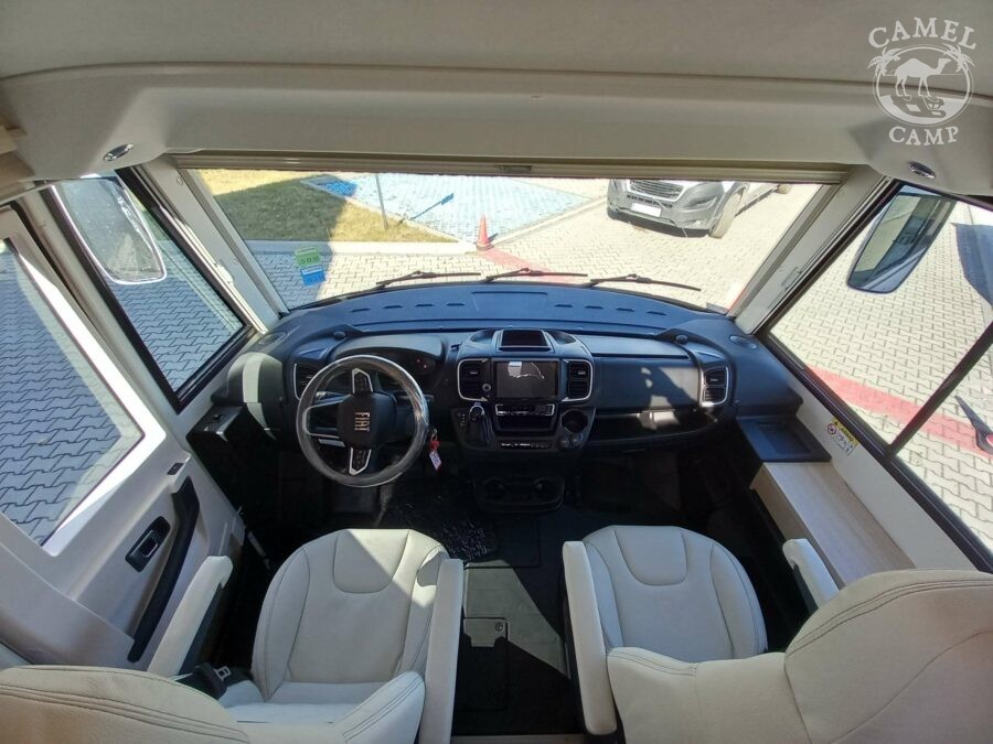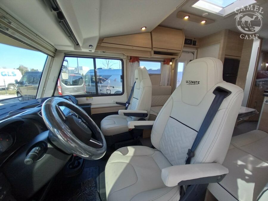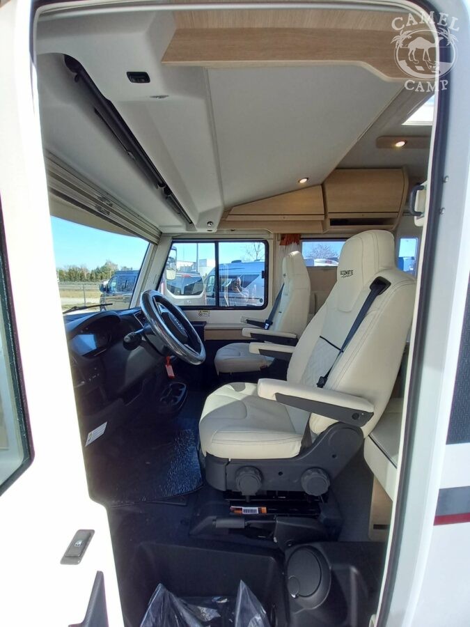 PACK ULTIMATE LINE 2025 – (dla: 8066dF, 8096dF) – specjalna kolorystyka zewnętrzna, tapicerka PALMA lub NOUMEA, poduszki ULTIMATE LINE, haft ULTIMATE LINE na zagłówkach foteli kabiny i wycieraczce w salonie, Alu-felgi 16″, skórzane wykończenie kierownicy i lewarka biegów, sterowanie radiem w kierownicy, TRUMA C6 EH z CP PLUS, ogrzewanie poprzez nogę stołu (z wyjątkiem teleskopowej nogi stołu), ogrzewany zbiornik wody brudnej, zintegrowany odkurzacz, ściemniacz oświetlenia w salonie i sypialni, drzwi prysznicowe z matowym wykończeniem zamykane na magnetyczne zatrzaski, czarna deska prysznicowa, łazienka z okładziną ścienną przypominającą pokład łodzi