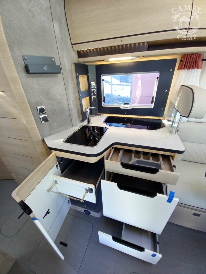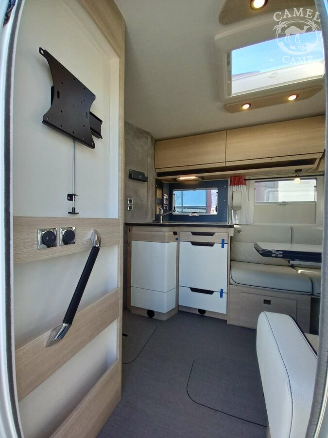 PACK SELECT – Traction + z asystentem wjazdu, DAB PIONEER® system multimedialny z ekranem 6.8” i APPLE CAR PLAY/ANDROID AUTO, RKE – drugi pilot kluczyków, kamera cofania z ekranem kontrolnym wbudowanym w deskę rozdzielczą, drzwi kempingowe blokowane w 2 punktach z oknem i koszem, moskitiera drzwi kempingowych, system do podłączenia 2 butli gazowych z czujnikiem przeciw wypadkowym, termiczne rolety w kabinie kierowcy (przednia regulowana góra/dół i dół/góra), drzwi kierowcy blokowane w 2 punktach, opony wielosezonowe
