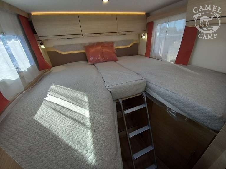 PACK 65 EDITION: specjalna dekoracja zewnętrzna 65 EDITION, lakier zewnętrzny szoferki IRON GREY (półintegra i VAN), tapicerka PALMA lub NOUMEA, hafty 65 EDITION, poduszki 65 EDITION, mata wejściowa z haftem 65 EDITION (696F i 666F), podświetlany zagłówek w sypialni, ogrzewany zbiornik wody szarej, radio PIONEER DAB 9” z funkcją APPLE CARPLAY / ANDROID AUTO, elektryczny hamulec ręczny, czarna deska prysznicowa, 1 x akumulator litowy 100 Ah, panel solarny 150 W