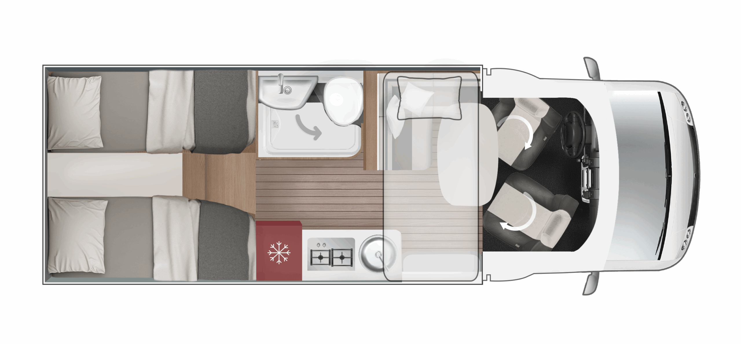 DMC 3500 kg, szerszy rozstaw osi, START&STOP, ABS + ESP, tempomat z limiterem prędkości, poduszka powietrzna kierowcy i pasażera, klimatyzacja automatyczna, lusterka boczne z odmrażaniem, radio DAB z 12” ekranem z Apple CarPlay / AndroidAuto, 70L zbiornik oleju napędowego, zestaw naprawczy koła, 16” stalowe koła z kołpakami, lakier kabiny biały, światła przeciwmgielne, elektryczny hamulec ręczny, automatyczne wycieraczki, automatyczne reflektory, światła dzienne halogenowe, kamera cofania, FORD emergency service, system CMBS (system ograniczający skutki kolizji), system monitorowania pasa ruchu, system rozpoznawania znaków prędkości, Wrong-Way system, przednie czujniki parkowania, TPMS – system monitorowania ciśnienia w oponach, 8” pół-cyfrowy panel komputera pokładowego, modem 5G, elektrycznie regulowana noga stołu w części salonu (230/30), elektrycznie regulowane łóżko opuszczane w części salonu, zagłówki foteli w układach face2face, okna SEITZ, 1 x ISOFIX, 100% LED światła tylne, gniazda USB w części salonu i sypialni, gniazdo 230V w garażu, drzwi XL z jednym punktem ryglowania, moskitiera drzwi kempingowych, 2 palnikowa kuchenka gazowa, lodówka absorpcyjna o pojemności 137 L, ogrzewanie Truma Gas Combi 4, termiczne zaciemnienia kabiny, okna dachowe Mini Heky 40 x 40 cm, okno dachowe w łazience 28 x 28 cm, możliwość połączenia łóżek pojedynczych, standardowa tapicerka Fitgrey / Cozy (materiał)