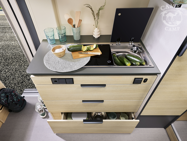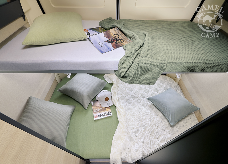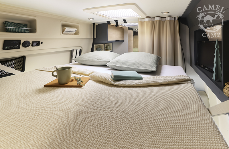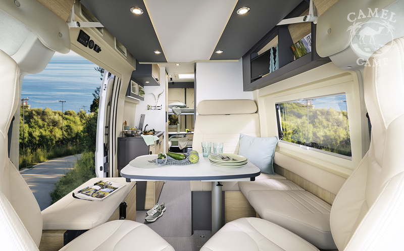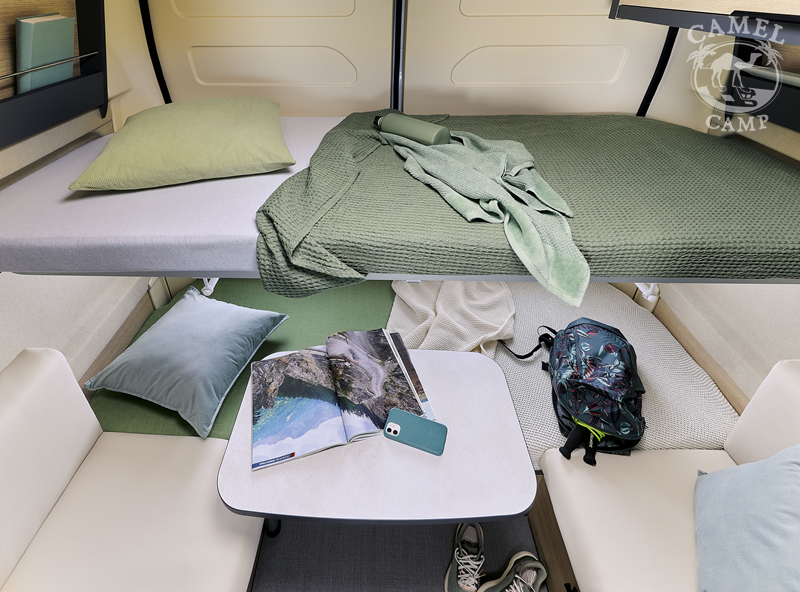 Zabudowa kempingowa: opuszczane łóżko, okna z podwójnymi szybami w zabudowie kempingowej, okna w tylnych drzwiach, ISOFIX tapicerka Origin, zamek centralny w kabinie i części mieszkalnej, regulowane obrotowe fotele z podłokietnikami, okablowanie radia (bez radia), zbiornik wyrównawczy układu wodnego zapewniający stałe ciśnienie, akumulator kempingowy AGM 92 Ah, ogrzewanie diesel Webasto 4 KW, 8 L podgrzewacz wody gazowy WHALE, przedłużenie blatu, regał na przyprawy, centralnie zamykane szuflady w kuchni, lodówka z zamrażalnikiem 149L, zbiornik wody czystej 95L, zbiornik wody szarej 85L, okablowanie i przygotowanie do montażu panelu solarnego oraz TV